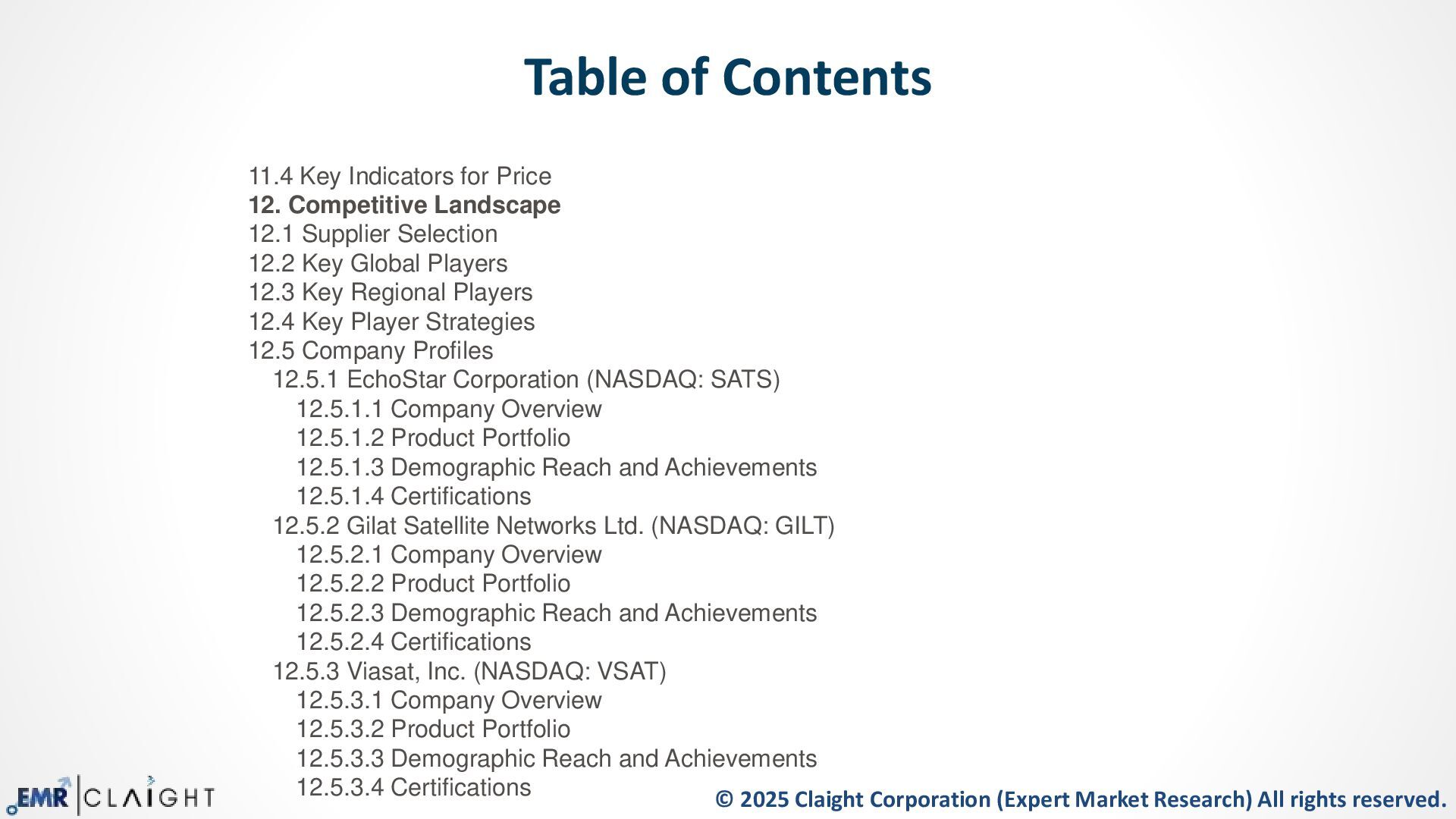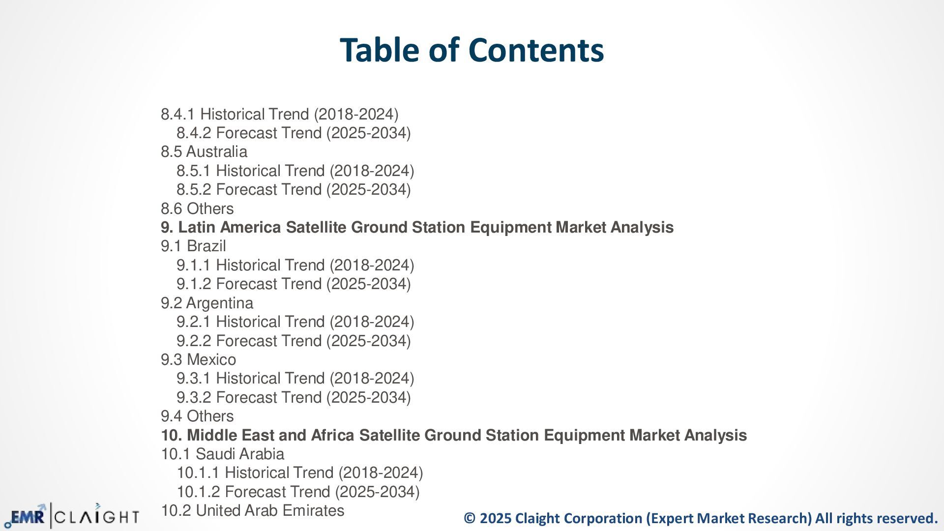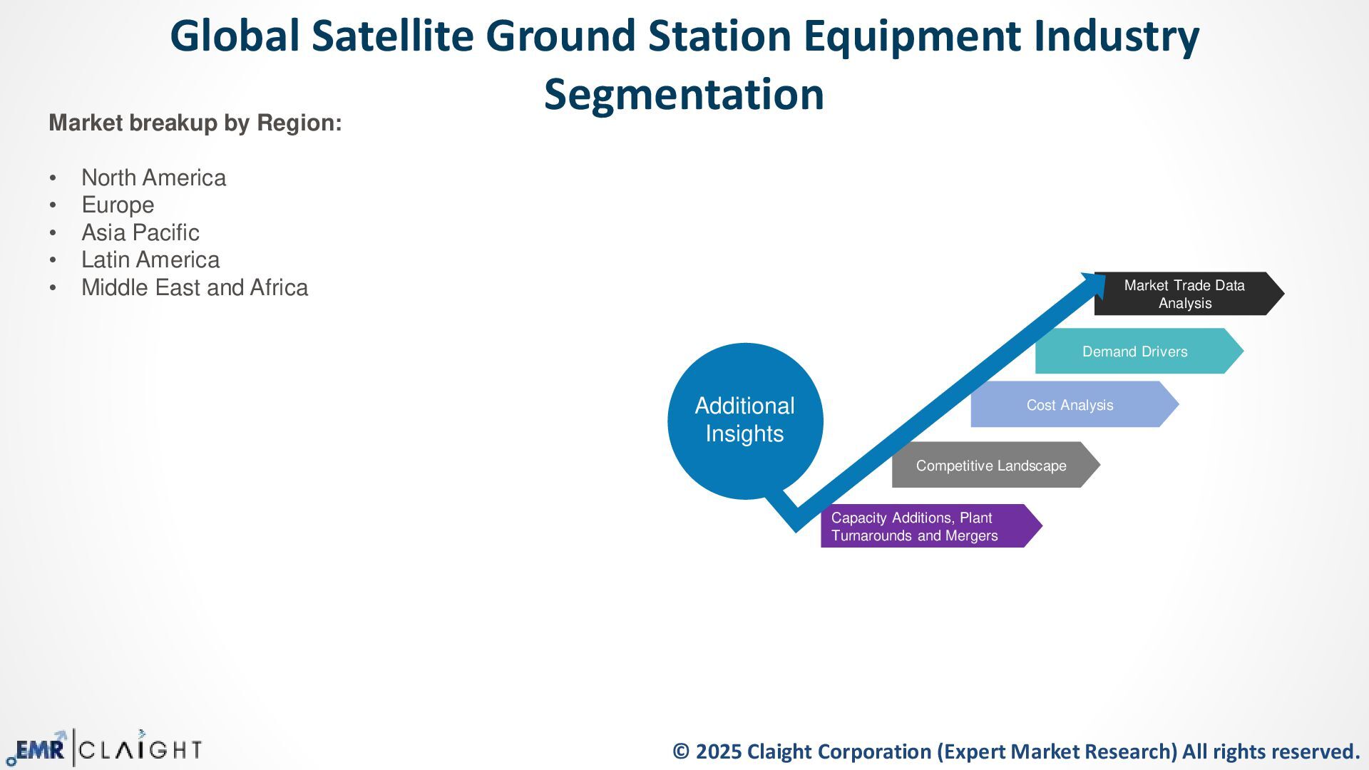 Global Satellite Ground Station Equipment Industry Segmentation 05 01 This is a sample text. Trade Data Analysis Market breakup by Region: • North America • Europe • Asia Pacific • Latin America • Middle East and Africa 01 Trade Data Analysis Capacity Additions, Plant Turnarounds and Mergers Competitive Landscape Cost Analysis Demand Drivers Market Trade Data Analysis Additional Insights