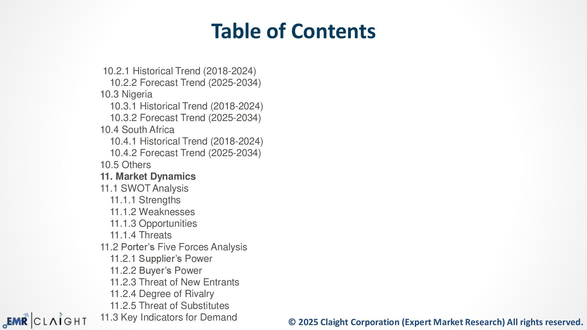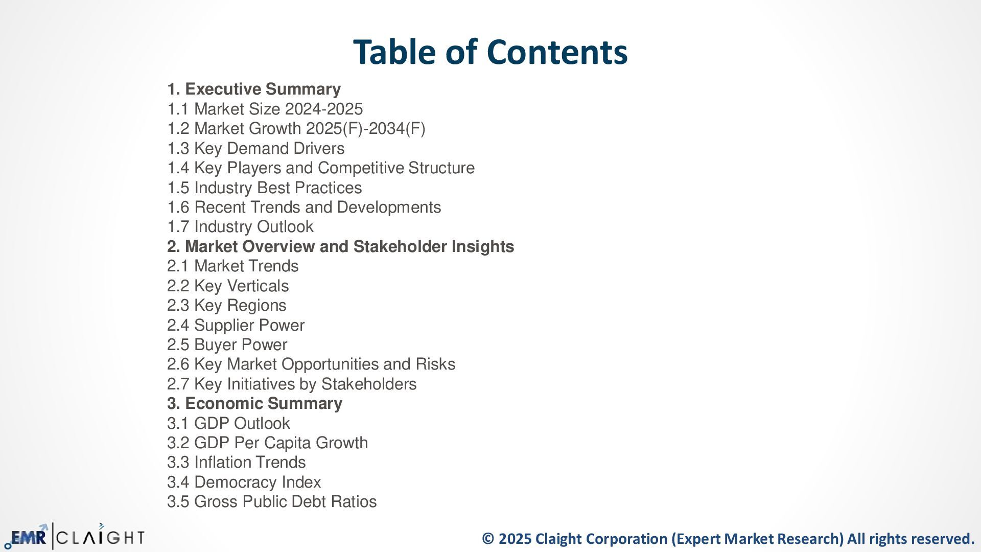Table of Contents 1. Executive Summary 1.1 Market Size 2024-2025 1.2 Market Growth 2025(F)-2034(F) 1.3 Key Demand Drivers 1.4 Key Players and Competitive Structure 1.5 Industry Best Practices 1.6 Recent Trends and Developments 1.7 Industry Outlook 2. Market Overview and Stakeholder Insights 2.1 Market Trends 2.2 Key Verticals 2.3 Key Regions 2.4 Supplier Power 2.5 Buyer Power 2.6 Key Market Opportunities and Risks 2.7 Key Initiatives by Stakeholders 3. Economic Summary 3.1 GDP Outlook 3.2 GDP Per Capita Growth 3.3 Inflation Trends 3.4 Democracy Index 3.5 Gross Public Debt Ratios