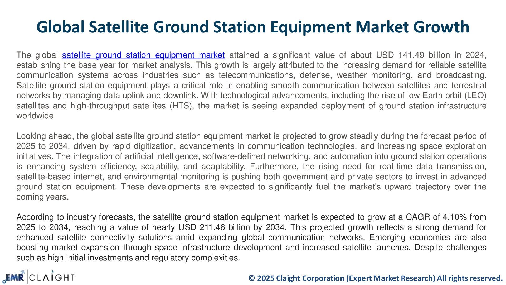Global Satellite Ground Station Equipment Market Growth 05 01 This is a sample text. Trade Data Analysis The global satellite ground station equipment market attained a significant value of about USD 141.49 billion in 2024, establishing the base year for market analysis. This growth is largely attributed to the increasing demand for reliable satellite communication systems across industries such as telecommunications, defense, weather monitoring, and broadcasting. Satellite ground station equipment plays a critical role in enabling smooth communication between satellites and terrestrial networks by managing data uplink and downlink. With technological advancements, including the rise of low-Earth orbit (LEO) satellites and high-throughput satellites (HTS), the market is seeing expanded deployment of ground station infrastructure worldwide Looking ahead, the global satellite ground station equipment market is projected to grow steadily during the forecast period of 2025 to 2034, driven by rapid digitization, advancements in communication technologies, and increasing space exploration initiatives. The integration of artificial intelligence, software-defined networking, and automation into ground station operations is enhancing system efficiency, scalability, and adaptability. Furthermore, the rising need for real-time data transmission, satellite-based internet, and environmental monitoring is pushing both government and private sectors to invest in advanced ground station equipment. These developments are expected to significantly fuel the market's upward trajectory over the coming years. According to industry forecasts, the satellite ground station equipment market is expected to grow at a CAGR of 4.10% from 2025 to 2034, reaching a value of nearly USD 211.46 billion by 2034. This projected growth reflects a strong demand for enhanced satellite connectivity solutions amid expanding global communication networks. Emerging economies are also boosting market expansion through space infrastructure development and increased satellite launches. Despite challenges such as high initial investments and regulatory complexities.