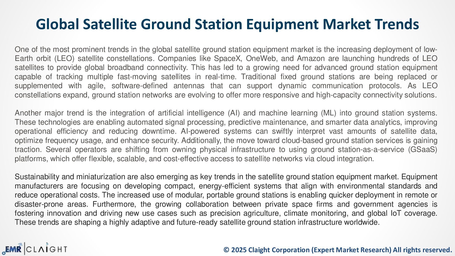 Global Satellite Ground Station Equipment Market Trends 05 01 This is a sample text. Trade Data Analysis One of the most prominent trends in the global satellite ground station equipment market is the increasing deployment of low- Earth orbit (LEO) satellite constellations. Companies like SpaceX, OneWeb, and Amazon are launching hundreds of LEO satellites to provide global broadband connectivity. This has led to a growing need for advanced ground station equipment capable of tracking multiple fast-moving satellites in real-time. Traditional fixed ground stations are being replaced or supplemented with agile, software-defined antennas that can support dynamic communication protocols. As LEO constellations expand, ground station networks are evolving to offer more responsive and high-capacity connectivity solutions. Another major trend is the integration of artificial intelligence (AI) and machine learning (ML) into ground station systems. These technologies are enabling automated signal processing, predictive maintenance, and smarter data analytics, improving operational efficiency and reducing downtime. AI-powered systems can swiftly interpret vast amounts of satellite data, optimize frequency usage, and enhance security. Additionally, the move toward cloud-based ground station services is gaining traction. Several operators are shifting from owning physical infrastructure to using ground station-as-a-service (GSaaS) platforms, which offer flexible, scalable, and cost-effective access to satellite networks via cloud integration. Sustainability and miniaturization are also emerging as key trends in the satellite ground station equipment market. Equipment manufacturers are focusing on developing compact, energy-efficient systems that align with environmental standards and reduce operational costs. The increased use of modular, portable ground stations is enabling quicker deployment in remote or disaster-prone areas. Furthermore, the growing collaboration between private space firms and government agencies is fostering innovation and driving new use cases such as precision agriculture, climate monitoring, and global IoT coverage. These trends are shaping a highly adaptive and future-ready satellite ground station infrastructure worldwide.