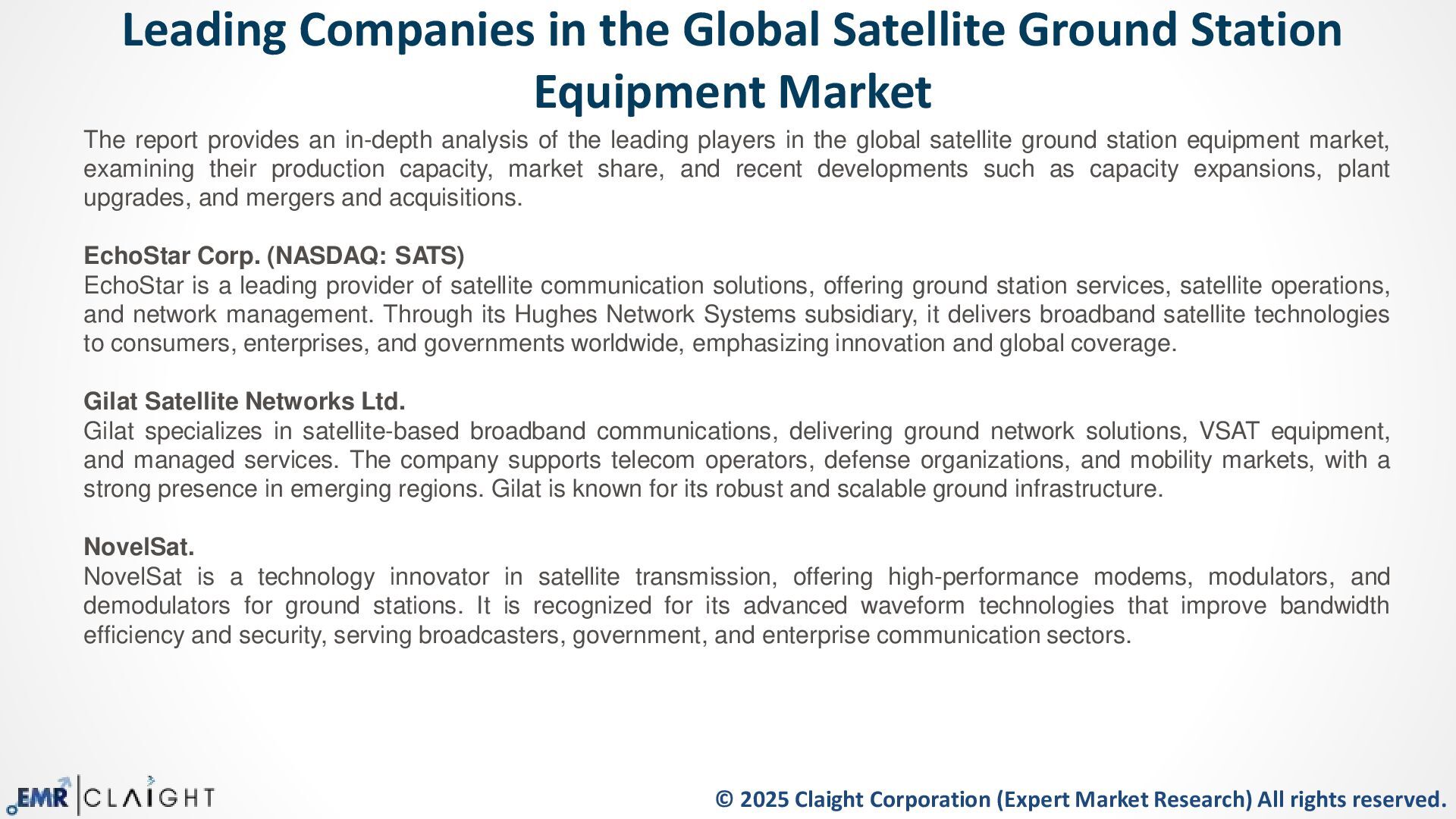 Leading Companies in the Global Satellite Ground Station Equipment Market The report provides an in-depth analysis of the leading players in the global satellite ground station equipment market, examining their production capacity, market share, and recent developments such as capacity expansions, plant upgrades, and mergers and acquisitions. EchoStar Corp. (NASDAQ: SATS) EchoStar is a leading provider of satellite communication solutions, offering ground station services, satellite operations, and network management. Through its Hughes Network Systems subsidiary, it delivers broadband satellite technologies to consumers, enterprises, and governments worldwide, emphasizing innovation and global coverage. Gilat Satellite Networks Ltd. Gilat specializes in satellite-based broadband communications, delivering ground network solutions, VSAT equipment, and managed services. The company supports telecom operators, defense organizations, and mobility markets, with a strong presence in emerging regions. Gilat is known for its robust and scalable ground infrastructure. NovelSat. NovelSat is a technology innovator in satellite transmission, offering high-performance modems, modulators, and demodulators for ground stations. It is recognized for its advanced waveform technologies that improve bandwidth efficiency and security, serving broadcasters, government, and enterprise communication sectors.