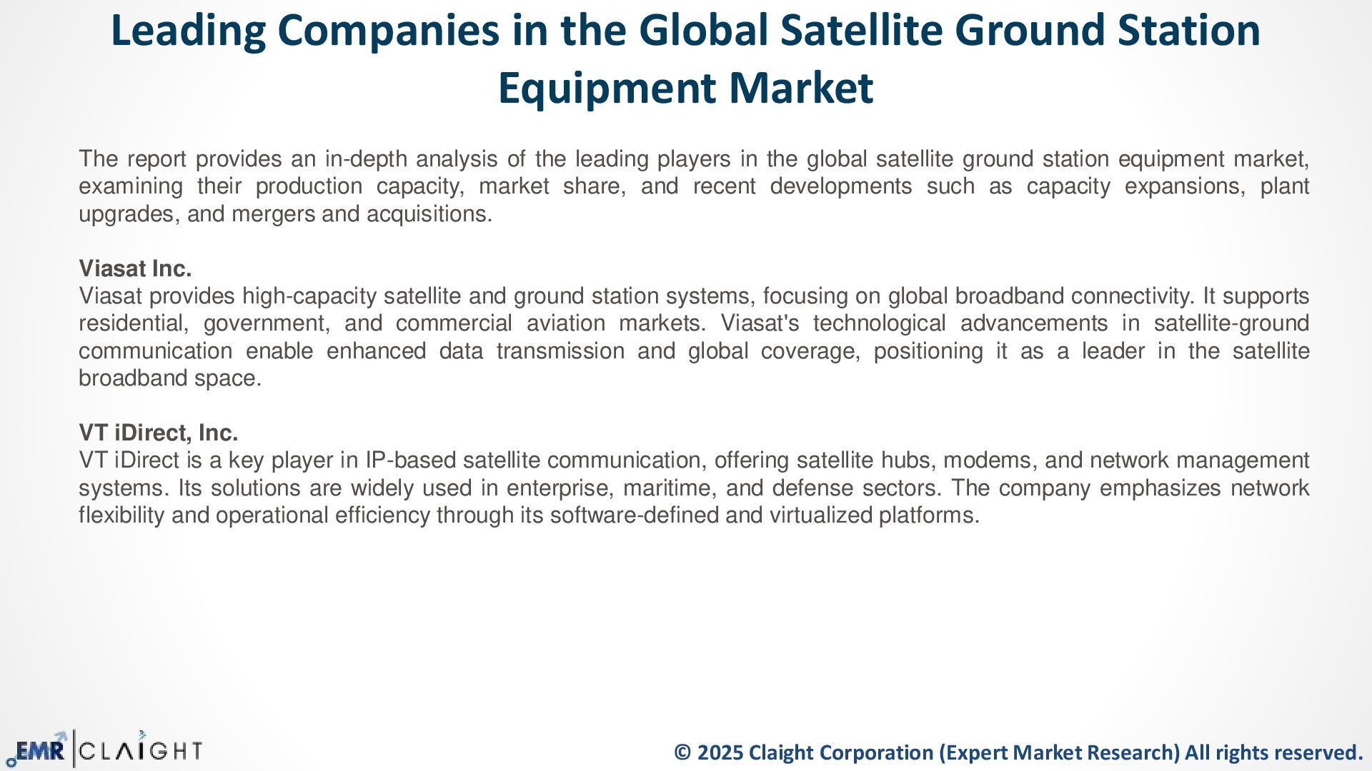 Leading Companies in the Global Satellite Ground Station Equipment Market The report provides an in-depth analysis of the leading players in the global satellite ground station equipment market, examining their production capacity, market share, and recent developments such as capacity expansions, plant upgrades, and mergers and acquisitions. Viasat Inc. Viasat provides high-capacity satellite and ground station systems, focusing on global broadband connectivity. It supports residential, government, and commercial aviation markets. Viasat's technological advancements in satellite-ground communication enable enhanced data transmission and global coverage, positioning it as a leader in the satellite broadband space. VT iDirect, Inc. VT iDirect is a key player in IP-based satellite communication, offering satellite hubs, modems, and network management systems. Its solutions are widely used in enterprise, maritime, and defense sectors. The company emphasizes network flexibility and operational efficiency through its software-defined and virtualized platforms.