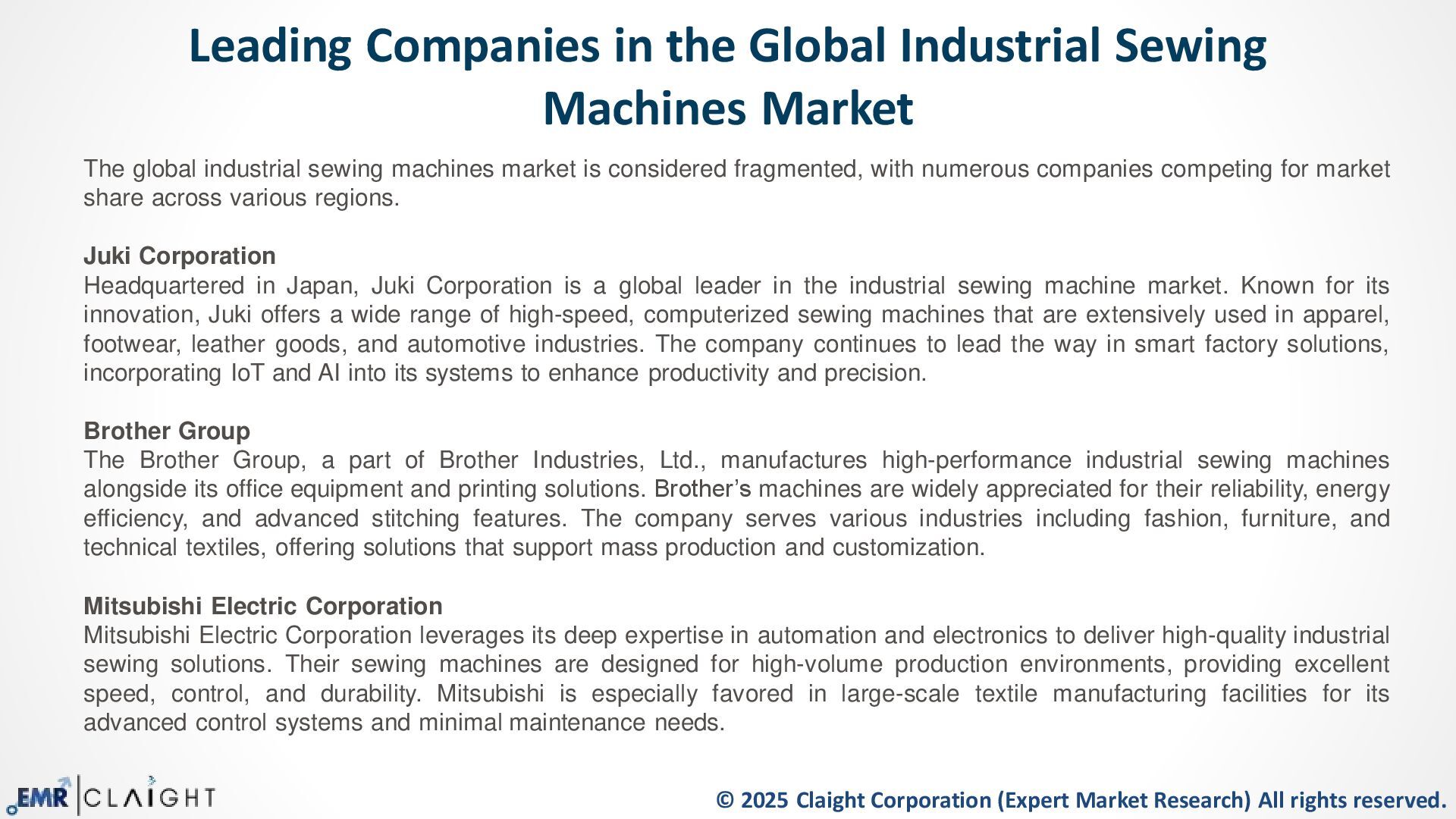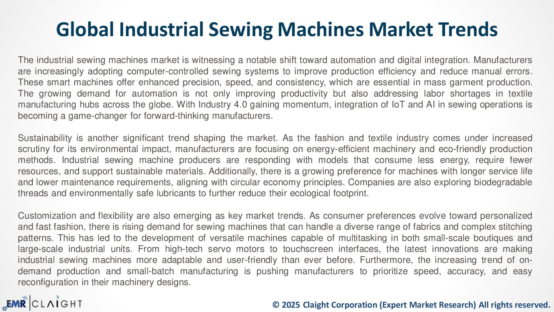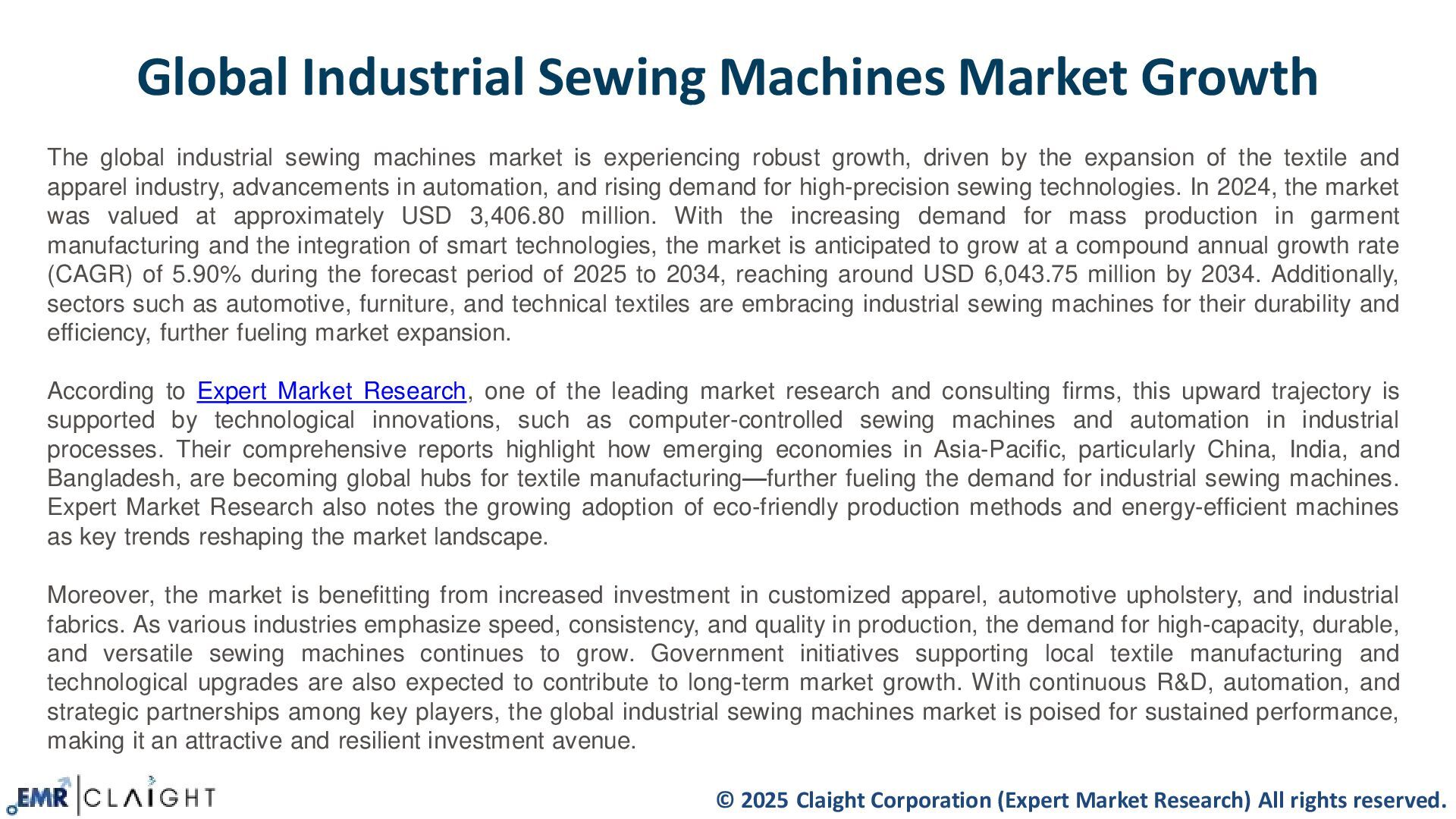 Global Industrial Sewing Machines Market Growth 05 01 This is a sample text. Trade Data Analysis The global industrial sewing machines market is experiencing robust growth, driven by the expansion of the textile and apparel industry, advancements in automation, and rising demand for high-precision sewing technologies. In 2024, the market was valued at approximately USD 3,406.80 million. With the increasing demand for mass production in garment manufacturing and the integration of smart technologies, the market is anticipated to grow at a compound annual growth rate (CAGR) of 5.90% during the forecast period of 2025 to 2034, reaching around USD 6,043.75 million by 2034. Additionally, sectors such as automotive, furniture, and technical textiles are embracing industrial sewing machines for their durability and efficiency, further fueling market expansion. According to Expert Market Research, one of the leading market research and consulting firms, this upward trajectory is supported by technological innovations, such as computer-controlled sewing machines and automation in industrial processes. Their comprehensive reports highlight how emerging economies in Asia-Pacific, particularly China, India, and Bangladesh, are becoming global hubs for textile manufacturing—further fueling the demand for industrial sewing machines. Expert Market Research also notes the growing adoption of eco-friendly production methods and energy-efficient machines as key trends reshaping the market landscape. Moreover, the market is benefitting from increased investment in customized apparel, automotive upholstery, and industrial fabrics. As various industries emphasize speed, consistency, and quality in production, the demand for high-capacity, durable, and versatile sewing machines continues to grow. Government initiatives supporting local textile manufacturing and technological upgrades are also expected to contribute to long-term market growth. With continuous R&D, automation, and strategic partnerships among key players, the global industrial sewing machines market is poised for sustained performance, making it an attractive and resilient investment avenue.