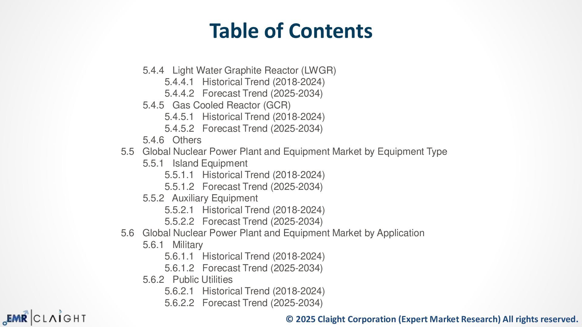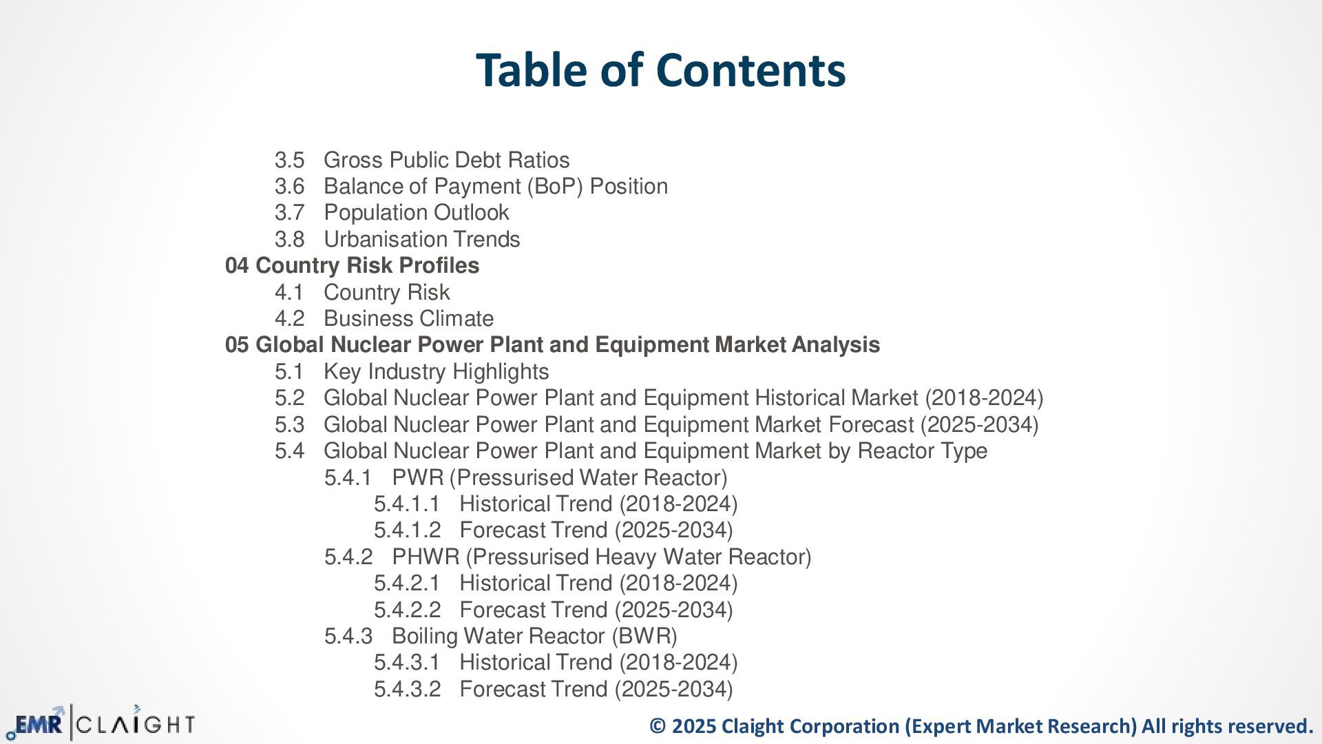 Table of Contents 3.5 Gross Public Debt Ratios 3.6 Balance of Payment (BoP) Position 3.7 Population Outlook 3.8 Urbanisation Trends 04 Country Risk Profiles 4.1 Country Risk 4.2 Business Climate 05 Global Nuclear Power Plant and Equipment Market Analysis 5.1 Key Industry Highlights 5.2 Global Nuclear Power Plant and Equipment Historical Market (2018-2024) 5.3 Global Nuclear Power Plant and Equipment Market Forecast (2025-2034) 5.4 Global Nuclear Power Plant and Equipment Market by Reactor Type 5.4.1 PWR (Pressurised Water Reactor) 5.4.1.1 Historical Trend (2018-2024) 5.4.1.2 Forecast Trend (2025-2034) 5.4.2 PHWR (Pressurised Heavy Water Reactor) 5.4.2.1 Historical Trend (2018-2024) 5.4.2.2 Forecast Trend (2025-2034) 5.4.3 Boiling Water Reactor (BWR) 5.4.3.1 Historical Trend (2018-2024) 5.4.3.2 Forecast Trend (2025-2034)