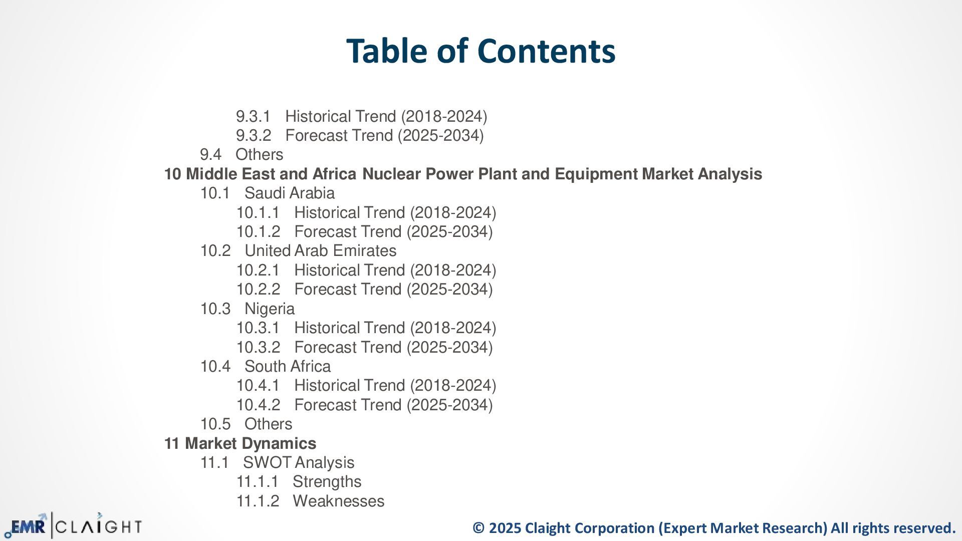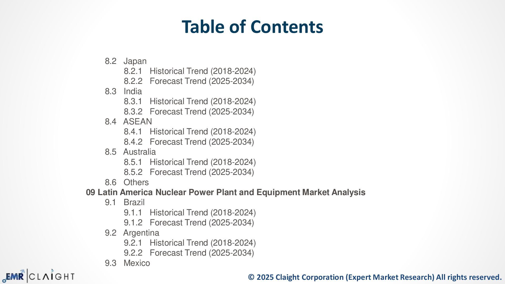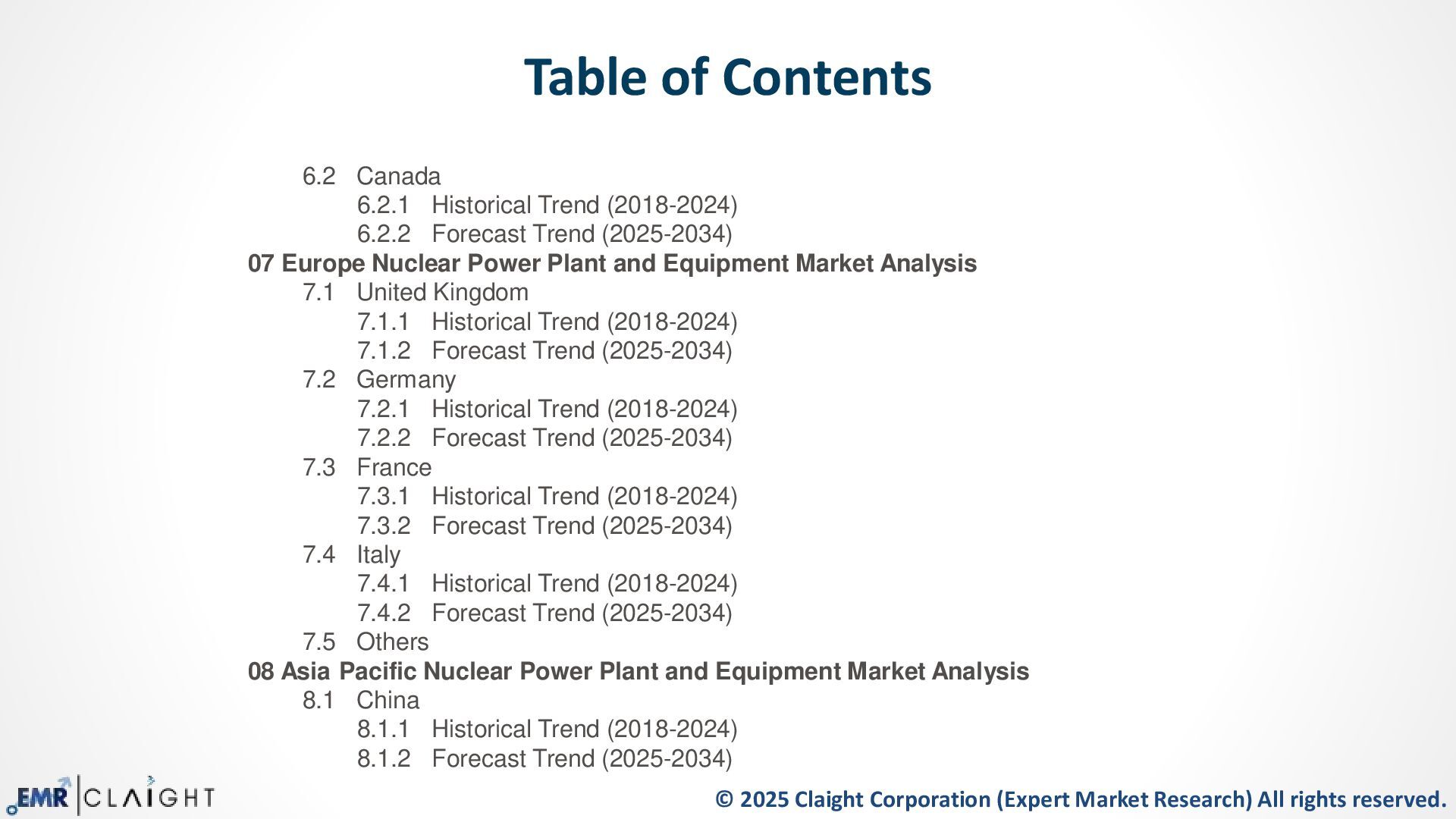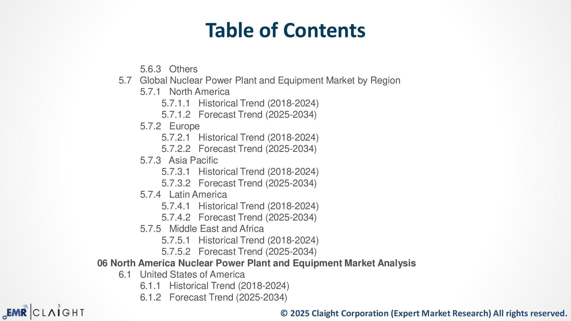 Table of Contents 5.6.3 Others 5.7 Global Nuclear Power Plant and Equipment Market by Region 5.7.1 North America 5.7.1.1 Historical Trend (2018-2024) 5.7.1.2 Forecast Trend (2025-2034) 5.7.2 Europe 5.7.2.1 Historical Trend (2018-2024) 5.7.2.2 Forecast Trend (2025-2034) 5.7.3 Asia Pacific 5.7.3.1 Historical Trend (2018-2024) 5.7.3.2 Forecast Trend (2025-2034) 5.7.4 Latin America 5.7.4.1 Historical Trend (2018-2024) 5.7.4.2 Forecast Trend (2025-2034) 5.7.5 Middle East and Africa 5.7.5.1 Historical Trend (2018-2024) 5.7.5.2 Forecast Trend (2025-2034) 06 North America Nuclear Power Plant and Equipment Market Analysis 6.1 United States of America 6.1.1 Historical Trend (2018-2024) 6.1.2 Forecast Trend (2025-2034)