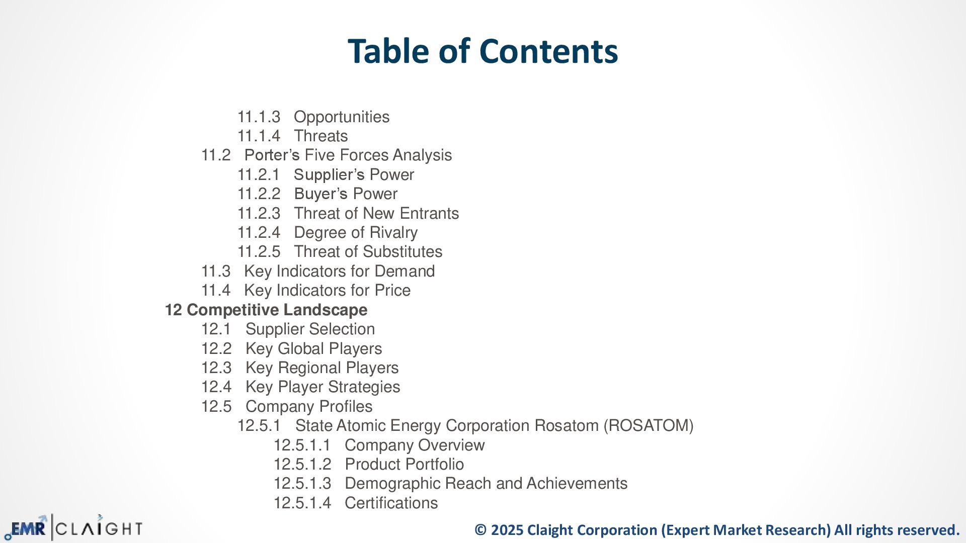 Table of Contents 11.1.3 Opportunities 11.1.4 Threats 11.2 Porter’s Five Forces Analysis 11.2.1 Supplier’s Power 11.2.2 Buyer’s Power 11.2.3 Threat of New Entrants 11.2.4 Degree of Rivalry 11.2.5 Threat of Substitutes 11.3 Key Indicators for Demand 11.4 Key Indicators for Price 12 Competitive Landscape 12.1 Supplier Selection 12.2 Key Global Players 12.3 Key Regional Players 12.4 Key Player Strategies 12.5 Company Profiles 12.5.1 State Atomic Energy Corporation Rosatom (ROSATOM) 12.5.1.1 Company Overview 12.5.1.2 Product Portfolio 12.5.1.3 Demographic Reach and Achievements 12.5.1.4 Certifications