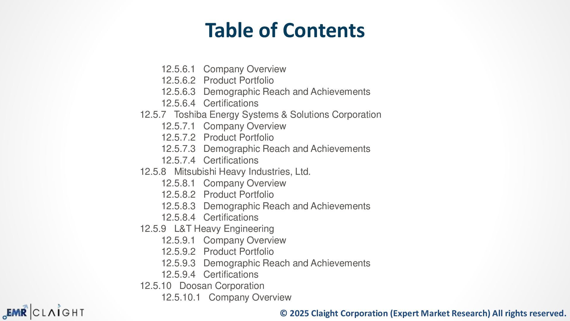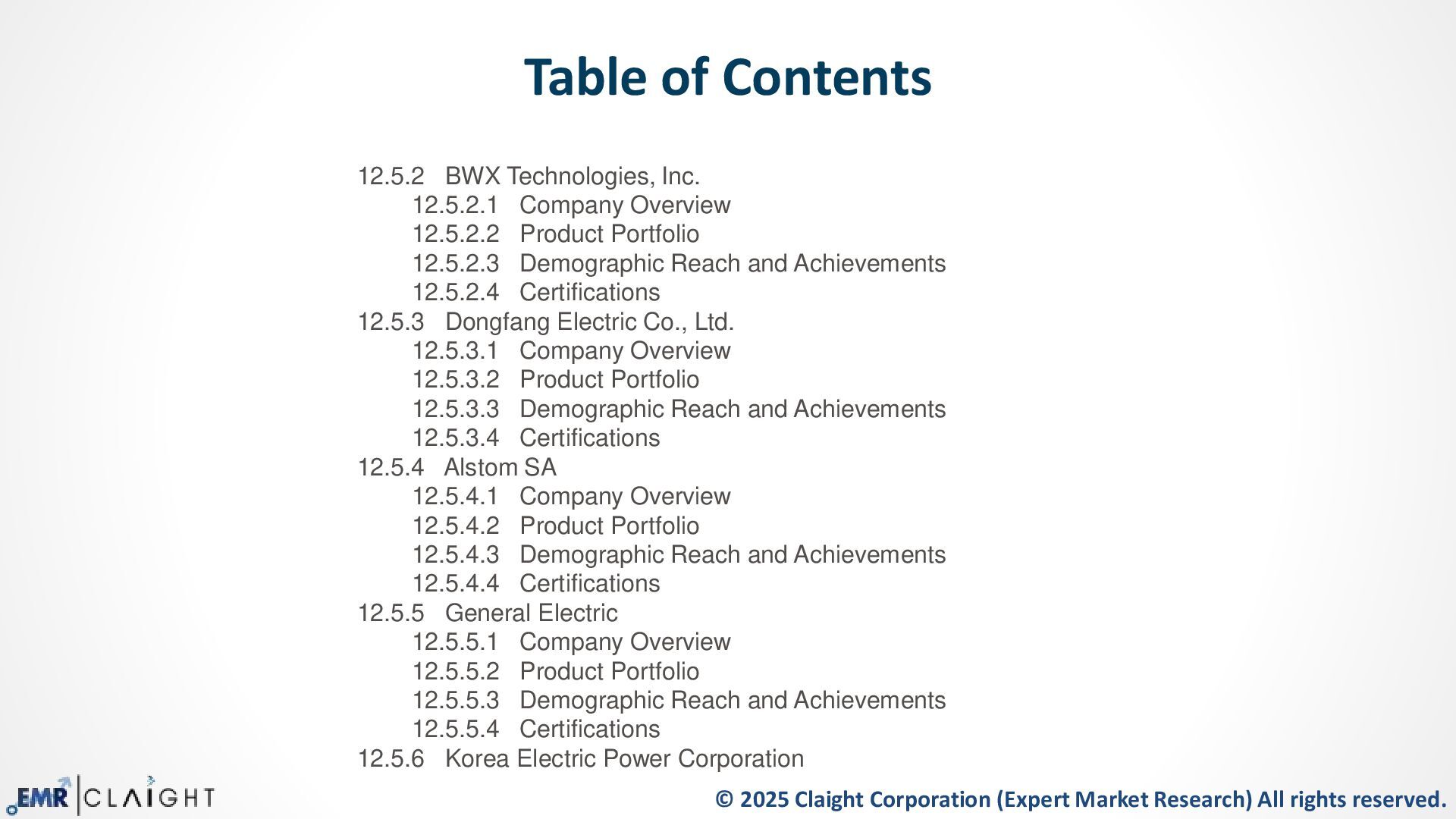 Table of Contents 12.5.2 BWX Technologies, Inc. 12.5.2.1 Company Overview 12.5.2.2 Product Portfolio 12.5.2.3 Demographic Reach and Achievements 12.5.2.4 Certifications 12.5.3 Dongfang Electric Co., Ltd. 12.5.3.1 Company Overview 12.5.3.2 Product Portfolio 12.5.3.3 Demographic Reach and Achievements 12.5.3.4 Certifications 12.5.4 Alstom SA 12.5.4.1 Company Overview 12.5.4.2 Product Portfolio 12.5.4.3 Demographic Reach and Achievements 12.5.4.4 Certifications 12.5.5 General Electric 12.5.5.1 Company Overview 12.5.5.2 Product Portfolio 12.5.5.3 Demographic Reach and Achievements 12.5.5.4 Certifications 12.5.6 Korea Electric Power Corporation