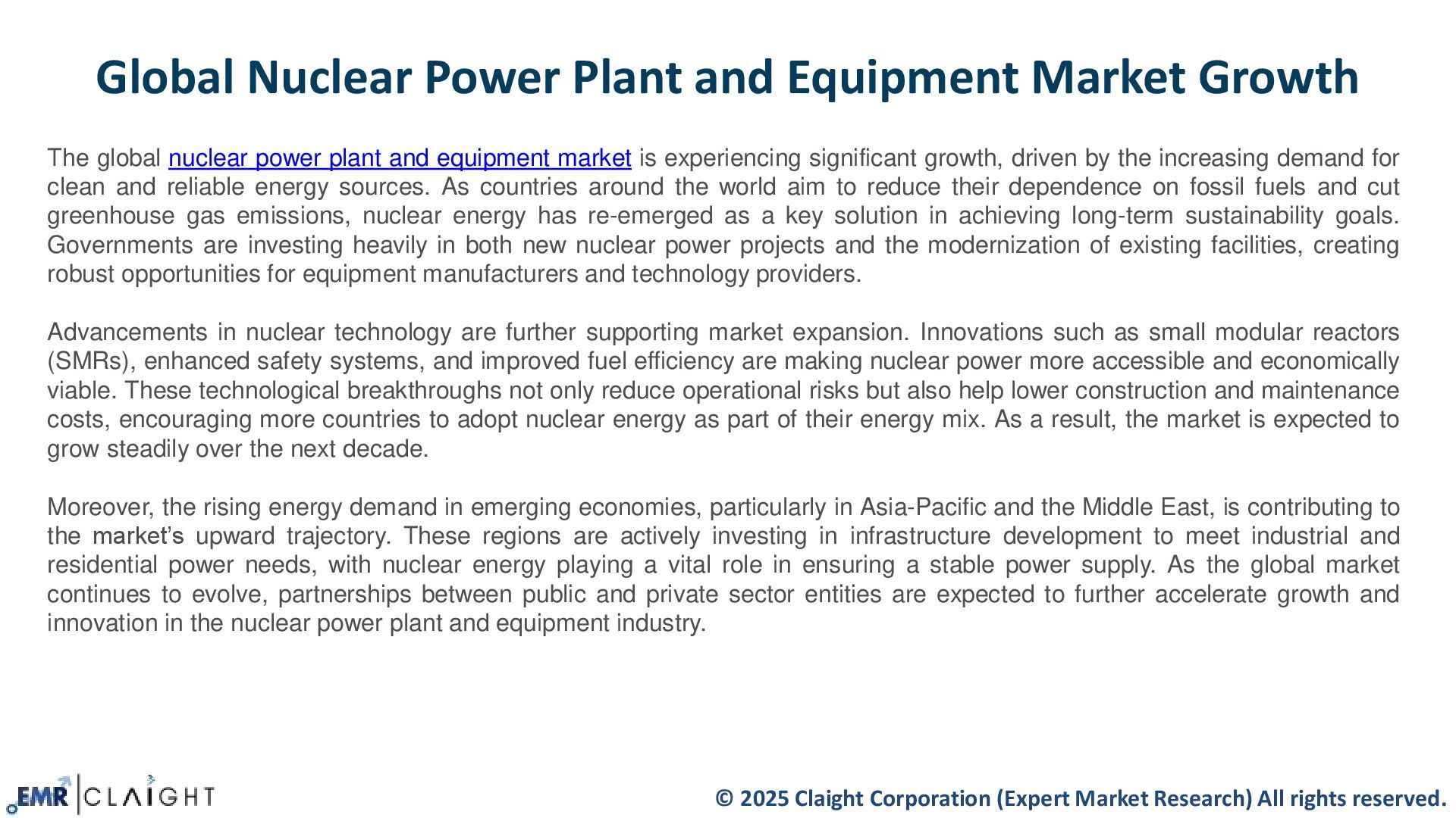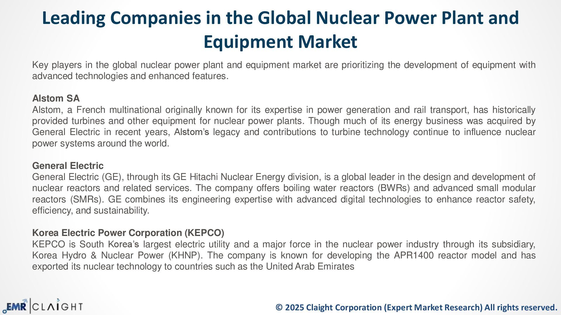 Leading Companies in the Global Nuclear Power Plant and Equipment Market Key players in the global nuclear power plant and equipment market are prioritizing the development of equipment with advanced technologies and enhanced features. Alstom SA Alstom, a French multinational originally known for its expertise in power generation and rail transport, has historically provided turbines and other equipment for nuclear power plants. Though much of its energy business was acquired by General Electric in recent years, Alstom’s legacy and contributions to turbine technology continue to influence nuclear power systems around the world. General Electric General Electric (GE), through its GE Hitachi Nuclear Energy division, is a global leader in the design and development of nuclear reactors and related services. The company offers boiling water reactors (BWRs) and advanced small modular reactors (SMRs). GE combines its engineering expertise with advanced digital technologies to enhance reactor safety, efficiency, and sustainability. Korea Electric Power Corporation (KEPCO) KEPCO is South Korea’s largest electric utility and a major force in the nuclear power industry through its subsidiary, Korea Hydro & Nuclear Power (KHNP). The company is known for developing the APR1400 reactor model and has exported its nuclear technology to countries such as the United Arab Emirates
