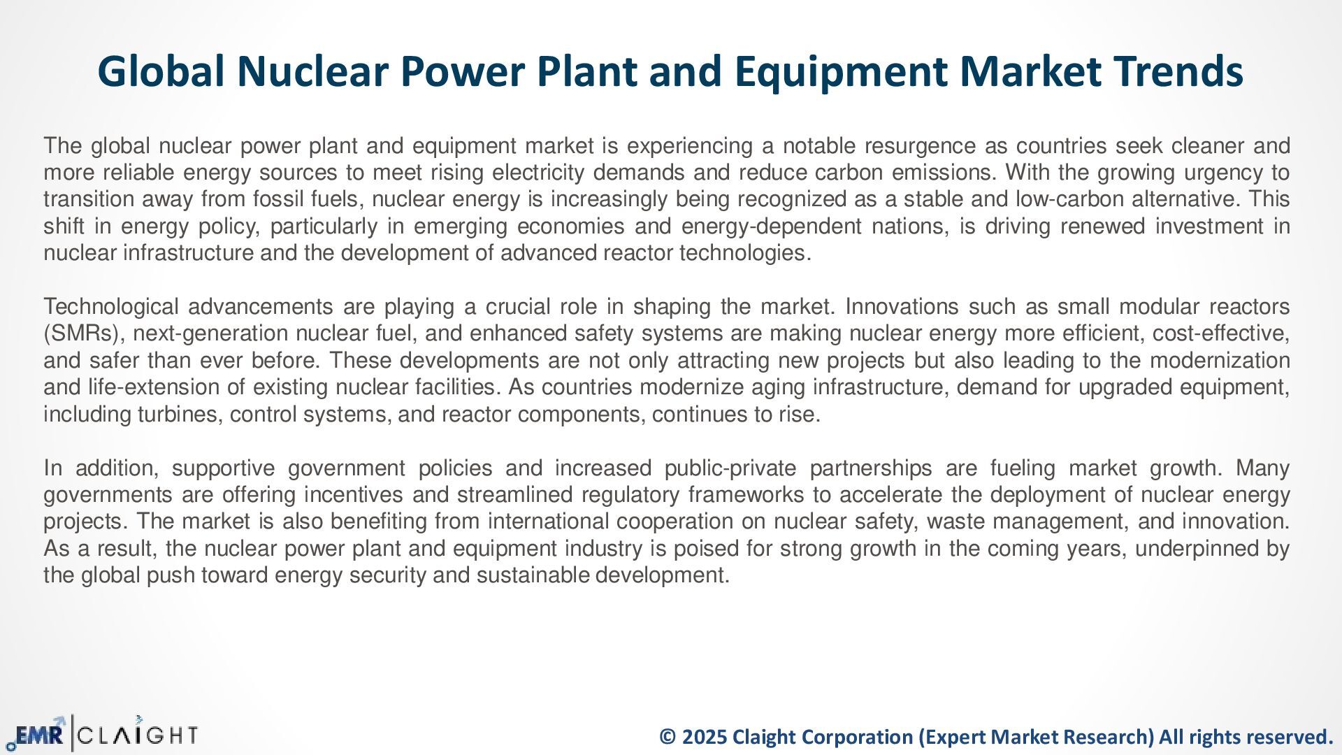 Global Nuclear Power Plant and Equipment Market Trends 05 01 This is a sample text. Trade Data Analysis The global nuclear power plant and equipment market is experiencing a notable resurgence as countries seek cleaner and more reliable energy sources to meet rising electricity demands and reduce carbon emissions. With the growing urgency to transition away from fossil fuels, nuclear energy is increasingly being recognized as a stable and low-carbon alternative. This shift in energy policy, particularly in emerging economies and energy-dependent nations, is driving renewed investment in nuclear infrastructure and the development of advanced reactor technologies. Technological advancements are playing a crucial role in shaping the market. Innovations such as small modular reactors (SMRs), next-generation nuclear fuel, and enhanced safety systems are making nuclear energy more efficient, cost-effective, and safer than ever before. These developments are not only attracting new projects but also leading to the modernization and life-extension of existing nuclear facilities. As countries modernize aging infrastructure, demand for upgraded equipment, including turbines, control systems, and reactor components, continues to rise. In addition, supportive government policies and increased public-private partnerships are fueling market growth. Many governments are offering incentives and streamlined regulatory frameworks to accelerate the deployment of nuclear energy projects. The market is also benefiting from international cooperation on nuclear safety, waste management, and innovation. As a result, the nuclear power plant and equipment industry is poised for strong growth in the coming years, underpinned by the global push toward energy security and sustainable development.