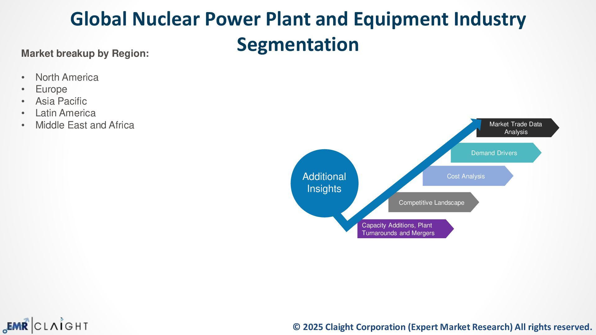 Global Nuclear Power Plant and Equipment Industry Segmentation 05 01 This is a sample text. Trade Data Analysis Market breakup by Region: • North America • Europe • Asia Pacific • Latin America • Middle East and Africa 01 Trade Data Analysis Capacity Additions, Plant Turnarounds and Mergers Competitive Landscape Cost Analysis Demand Drivers Market Trade Data Analysis Additional Insights
