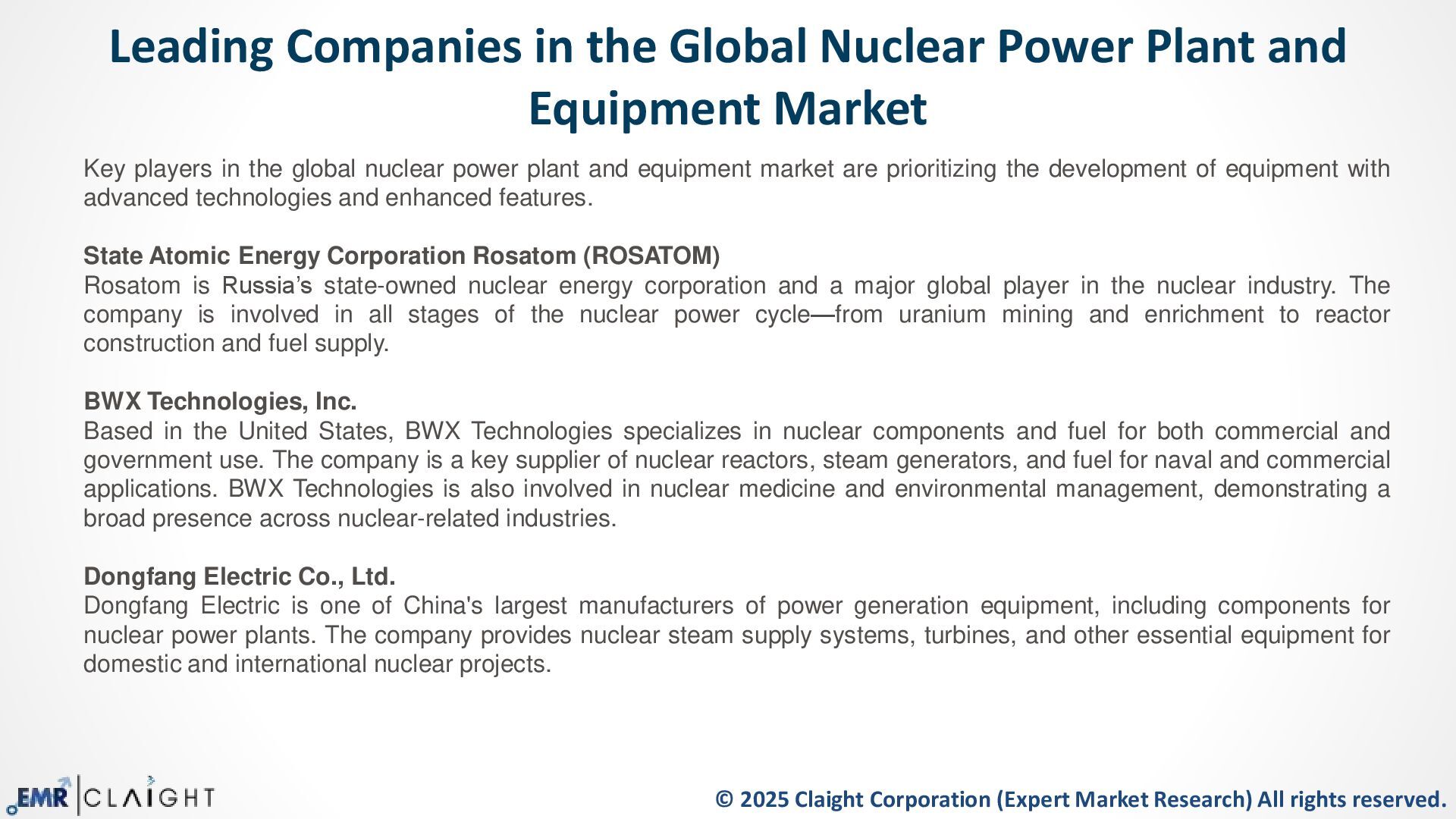 Leading Companies in the Global Nuclear Power Plant and Equipment Market Key players in the global nuclear power plant and equipment market are prioritizing the development of equipment with advanced technologies and enhanced features. State Atomic Energy Corporation Rosatom (ROSATOM) Rosatom is Russia’s state-owned nuclear energy corporation and a major global player in the nuclear industry. The company is involved in all stages of the nuclear power cycle—from uranium mining and enrichment to reactor construction and fuel supply. BWX Technologies, Inc. Based in the United States, BWX Technologies specializes in nuclear components and fuel for both commercial and government use. The company is a key supplier of nuclear reactors, steam generators, and fuel for naval and commercial applications. BWX Technologies is also involved in nuclear medicine and environmental management, demonstrating a broad presence across nuclear-related industries. Dongfang Electric Co., Ltd. Dongfang Electric is one of China's largest manufacturers of power generation equipment, including components for nuclear power plants. The company provides nuclear steam supply systems, turbines, and other essential equipment for domestic and international nuclear projects.