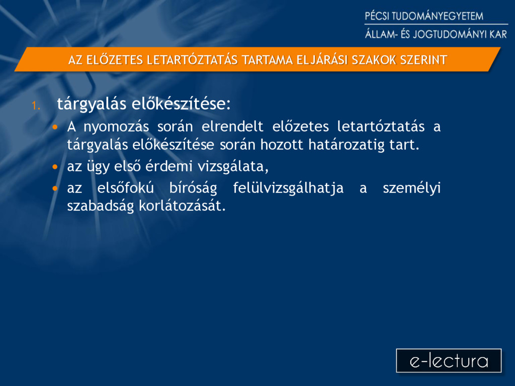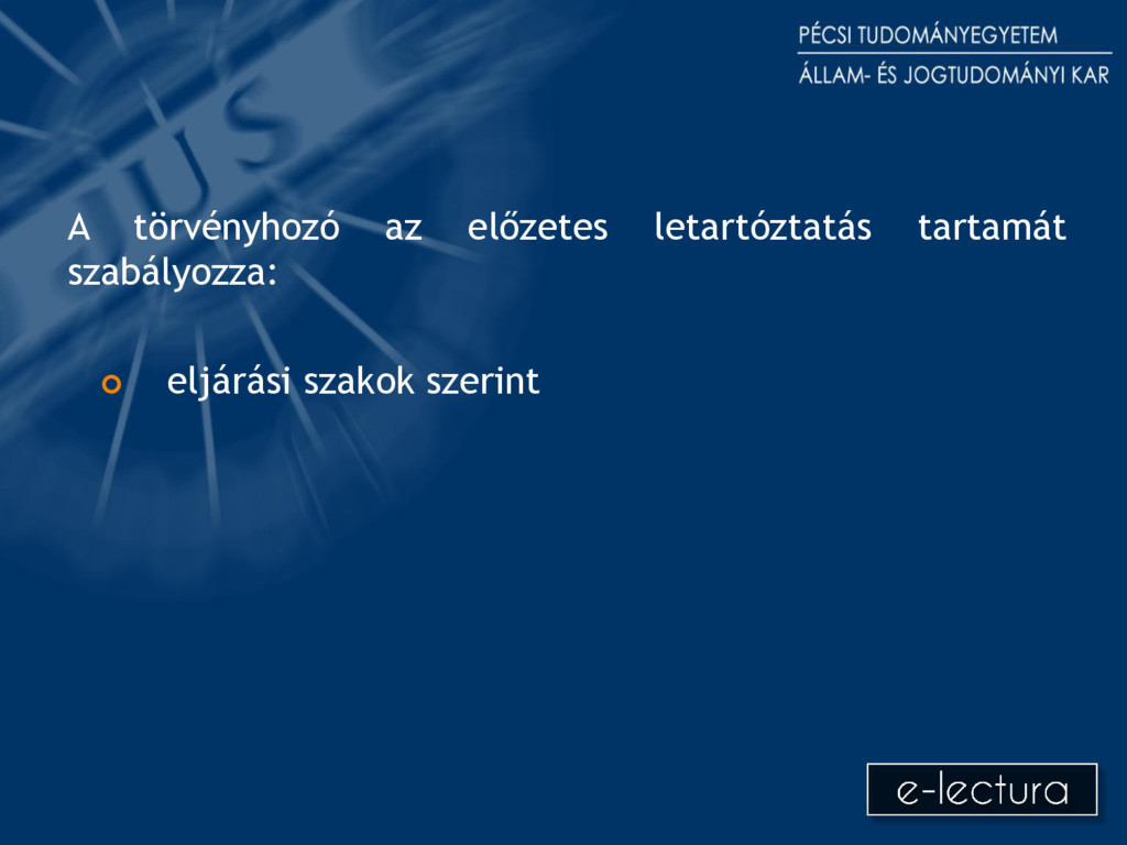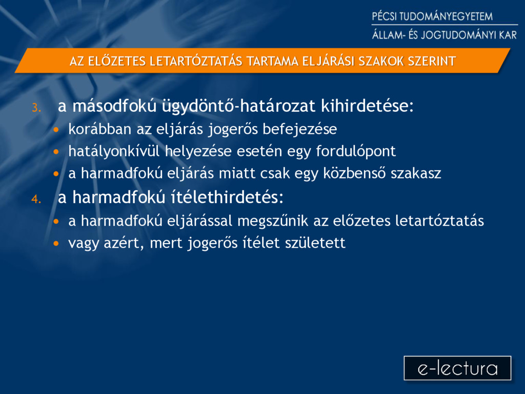 befejezése hatályonkívül helyezése esetén egy fordulópont a harmadfokú eljárás miatt csak egy közbenső szakasz 4. a harmadfokú ítélethirdetés: a harmadfokú eljárással megszűnik az előzetes letartóztatás vagy azért, mert jogerős ítélet született Így már nem kényszerintézkedés, mert eljárásjogi kényszerintézkedést csak az eljárás alatt lehet foganatosítani vagy pedig, hatályonkívül helyezés esetén, a harmadfokú bíróság dönt az előzetes letartóztatás szükségességéről AZ ELŐZETES LETARTÓZTATÁS TARTAMA ELJÁRÁSI SZAKOK SZERINT