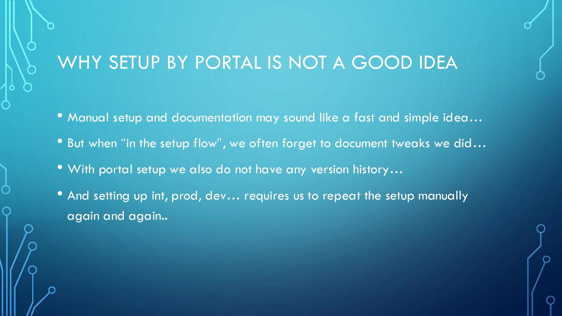 Manual setup and documentation may sound like a fast and simple idea… • But when “in the setup flow”, we often forget to document tweaks we did… • With portal setup we also do not have any version history… • And setting up int, prod, dev… requires us to repeat the setup manually again and again..