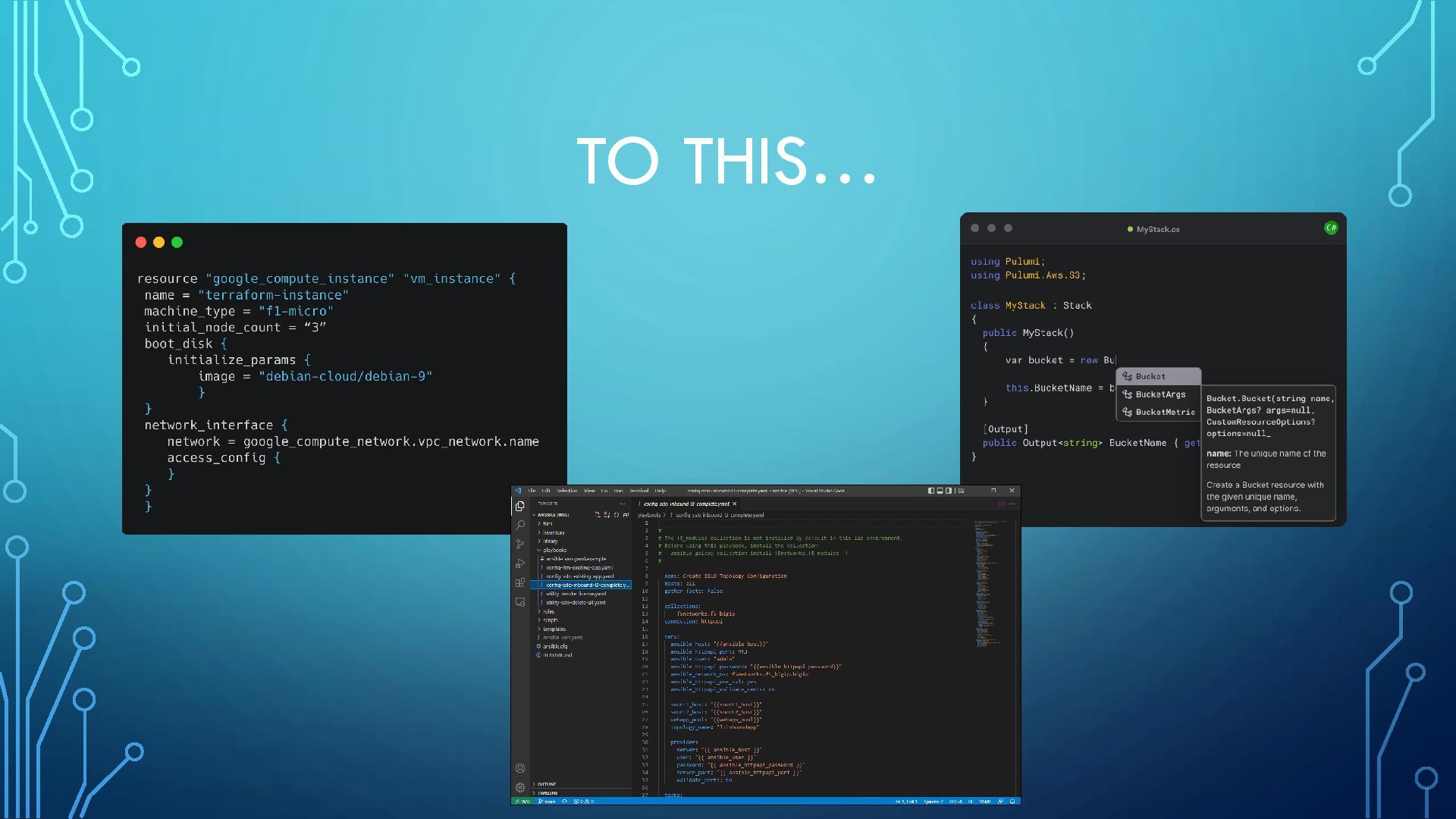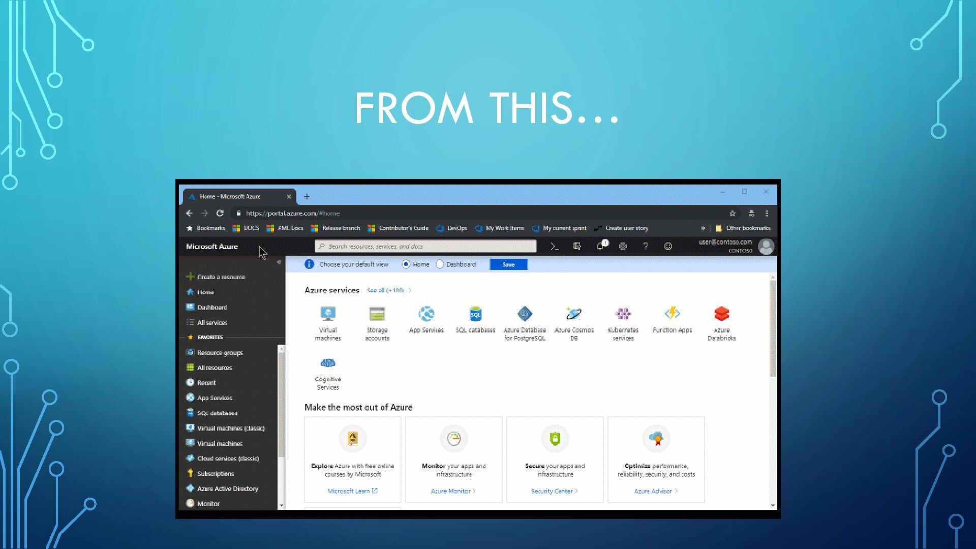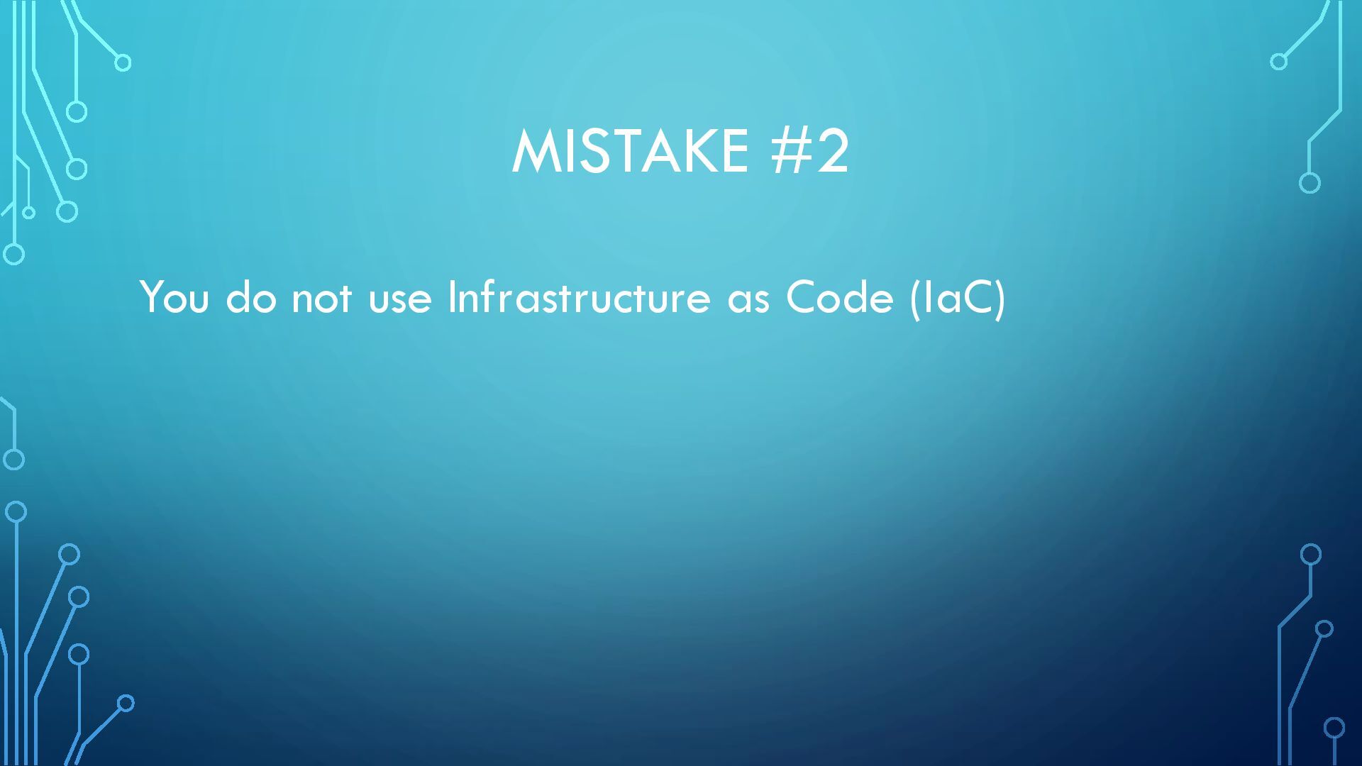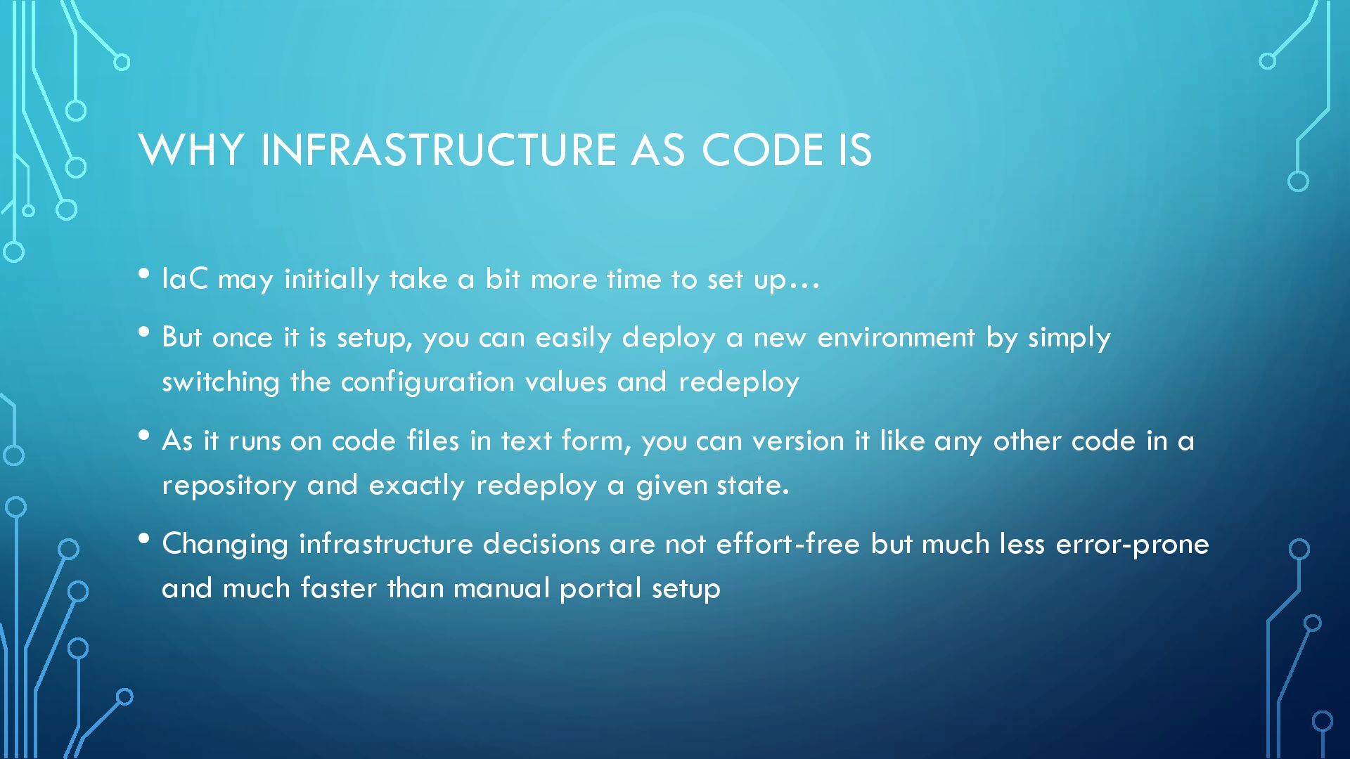 a bit more time to set up… • But once it is setup, you can easily deploy a new environment by simply switching the configuration values and redeploy • As it runs on code files in text form, you can version it like any other code in a repository and exactly redeploy a given state. • Changing infrastructure decisions are not effort-free but much less error-prone and much faster than manual portal setup