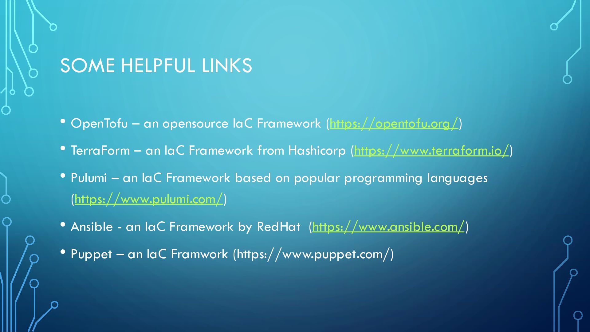 (https://opentofu.org/) • TerraForm – an IaC Framework from Hashicorp (https://www.terraform.io/) • Pulumi – an IaC Framework based on popular programming languages (https://www.pulumi.com/) • Ansible - an IaC Framework by RedHat (https://www.ansible.com/) • Puppet – an IaC Framwork (https://www.puppet.com/)