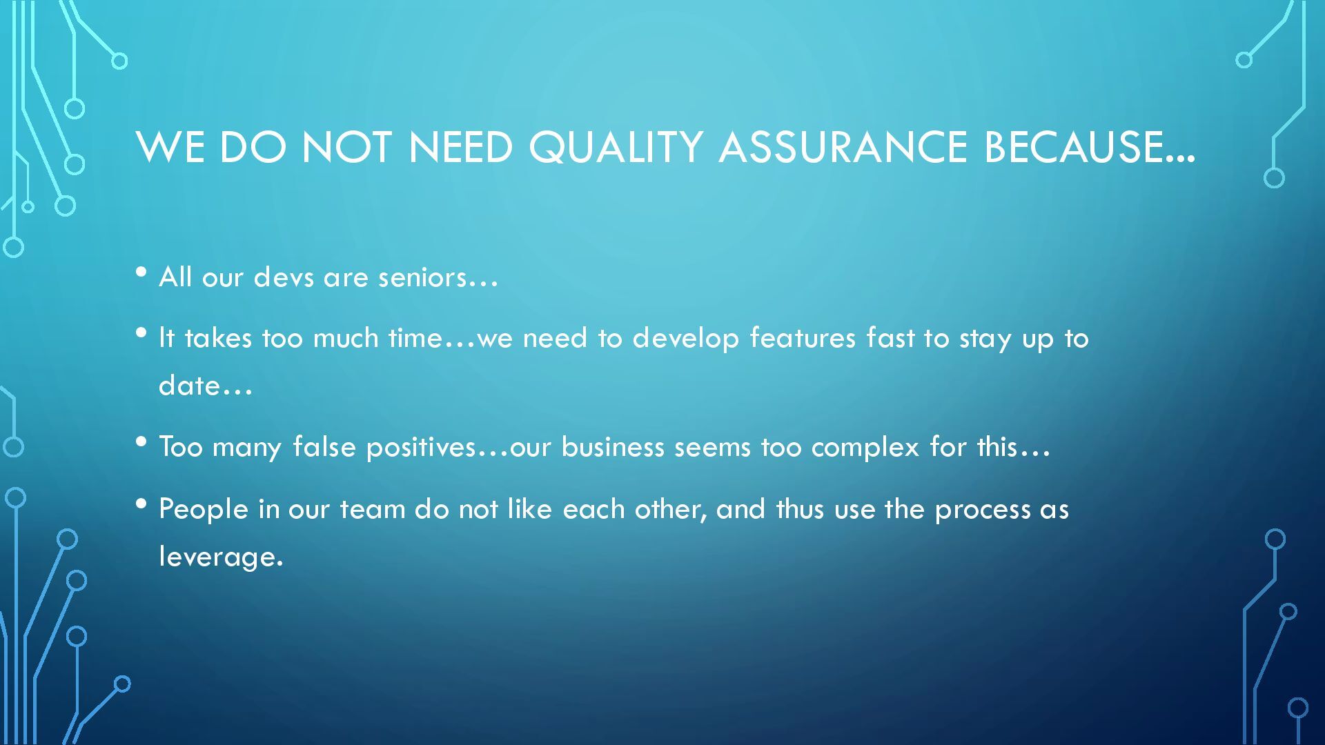 devs are seniors… • It takes too much time…we need to develop features fast to stay up to date… • Too many false positives…our business seems too complex for this… • People in our team do not like each other, and thus use the process as leverage.