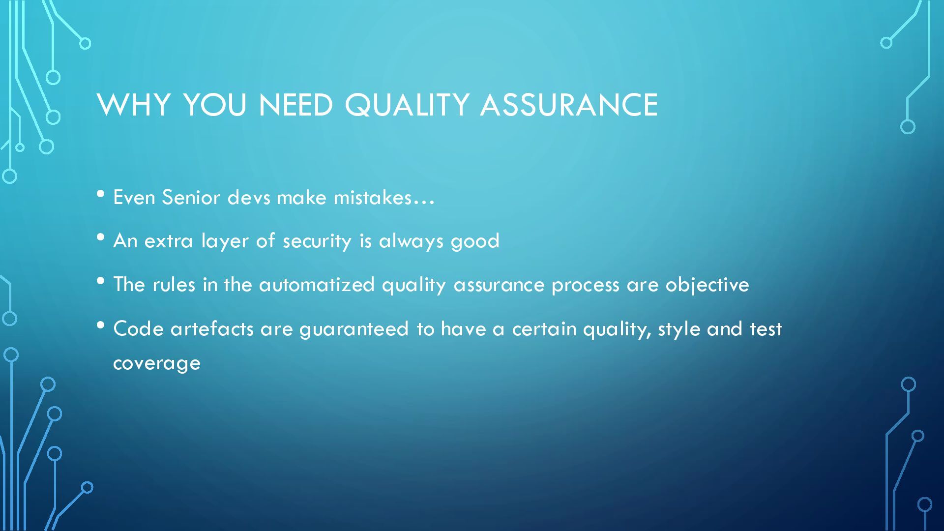 mistakes… • An extra layer of security is always good • The rules in the automatized quality assurance process are objective • Code artefacts are guaranteed to have a certain quality, style and test coverage