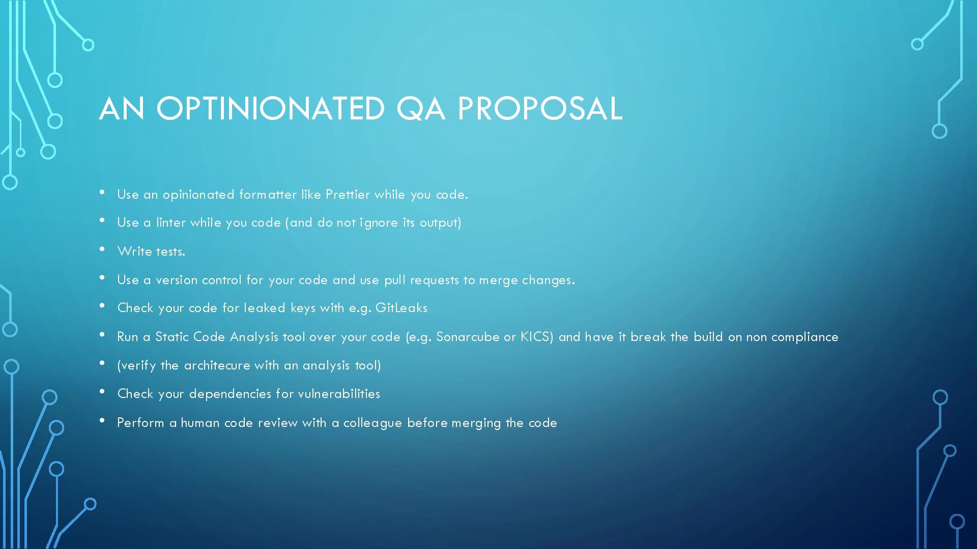 Prettier while you code. • Use a linter while you code (and do not ignore its output) • Write tests. • Use a version control for your code and use pull requests to merge changes. • Check your code for leaked keys with e.g. GitLeaks • Run a Static Code Analysis tool over your code (e.g. Sonarcube or KICS) and have it break the build on non compliance • (verify the architecure with an analysis tool) • Check your dependencies for vulnerabilities • Perform a human code review with a colleague before merging the code