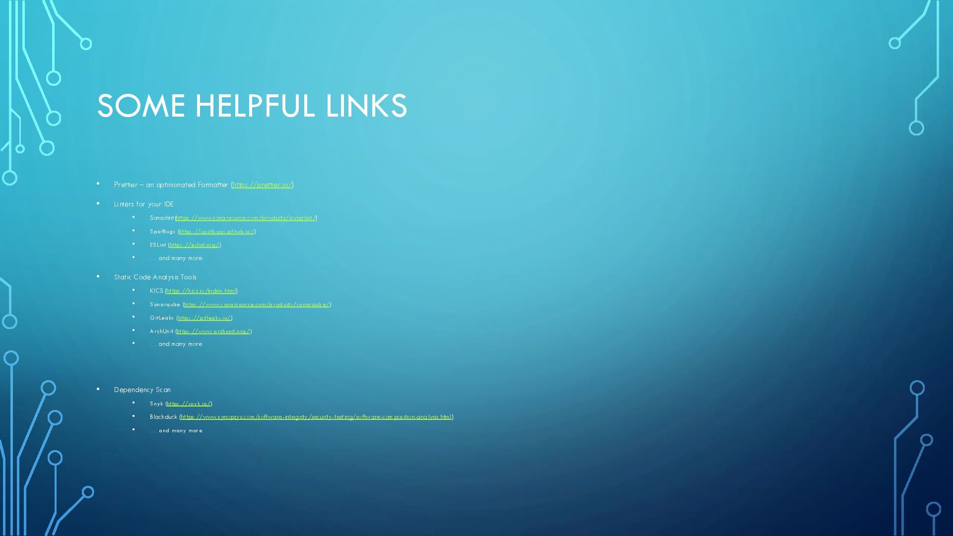 • Linters for your IDE • Sonarlint(https://www.sonarsource.com/products/sonarlint/) • SpotBugs (https://spotbugs.github.io/) • ESLint (https://eslint.org/) • … and many more • Static Code Analysis Tools • KICS (https://kics.io/index.html) • Sonarqube (https://www.sonarsource.com/products/sonarqube/) • GitLeaks (https://gitleaks.io/) • ArchUnit (https://www.archunit.org/) • … and many more • Dependency Scan • Snyk (https://snyk.io/) • Blackduck (https://www.synopsys.com/software-integrity/security-testing/software-composition-analysis.html) • … and many more