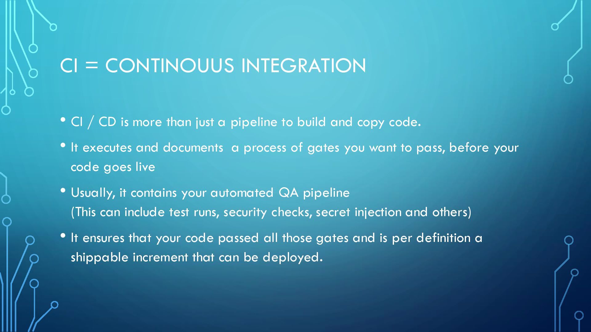 than just a pipeline to build and copy code. • It executes and documents a process of gates you want to pass, before your code goes live • Usually, it contains your automated QA pipeline (This can include test runs, security checks, secret injection and others) • It ensures that your code passed all those gates and is per definition a shippable increment that can be deployed.