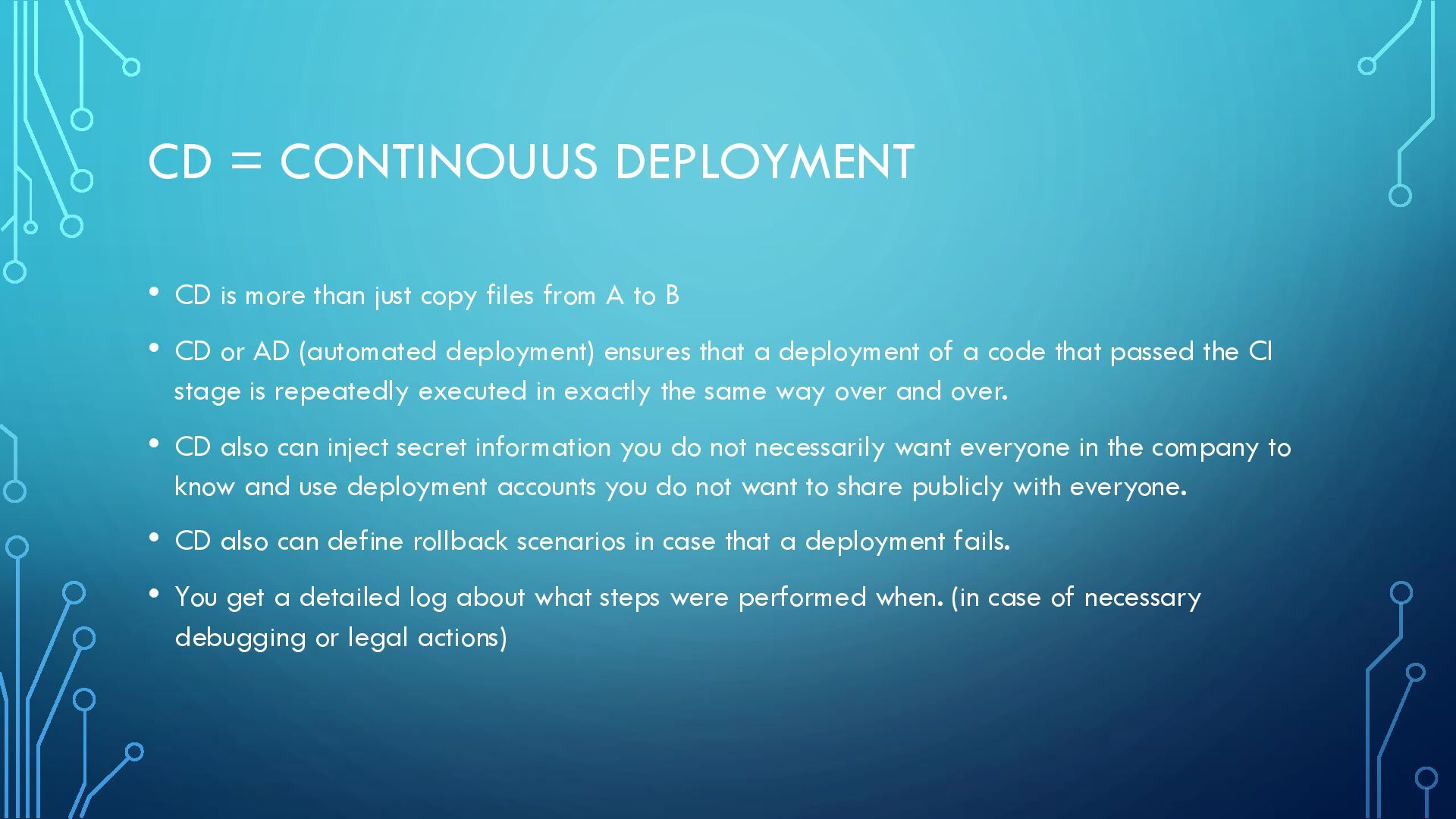 copy files from A to B • CD or AD (automated deployment) ensures that a deployment of a code that passed the CI stage is repeatedly executed in exactly the same way over and over. • CD also can inject secret information you do not necessarily want everyone in the company to know and use deployment accounts you do not want to share publicly with everyone. • CD also can define rollback scenarios in case that a deployment fails. • You get a detailed log about what steps were performed when. (in case of necessary debugging or legal actions)