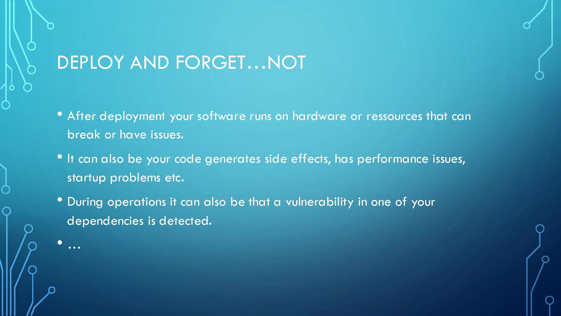 hardware or ressources that can break or have issues. • It can also be your code generates side effects, has performance issues, startup problems etc. • During operations it can also be that a vulnerability in one of your dependencies is detected. • …