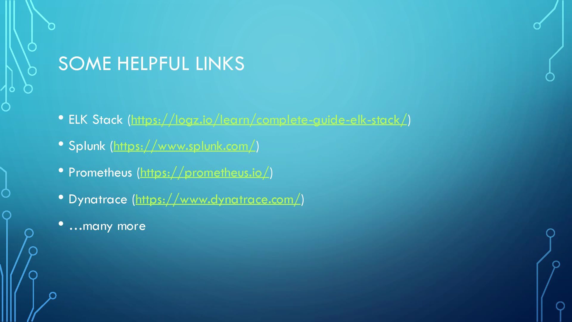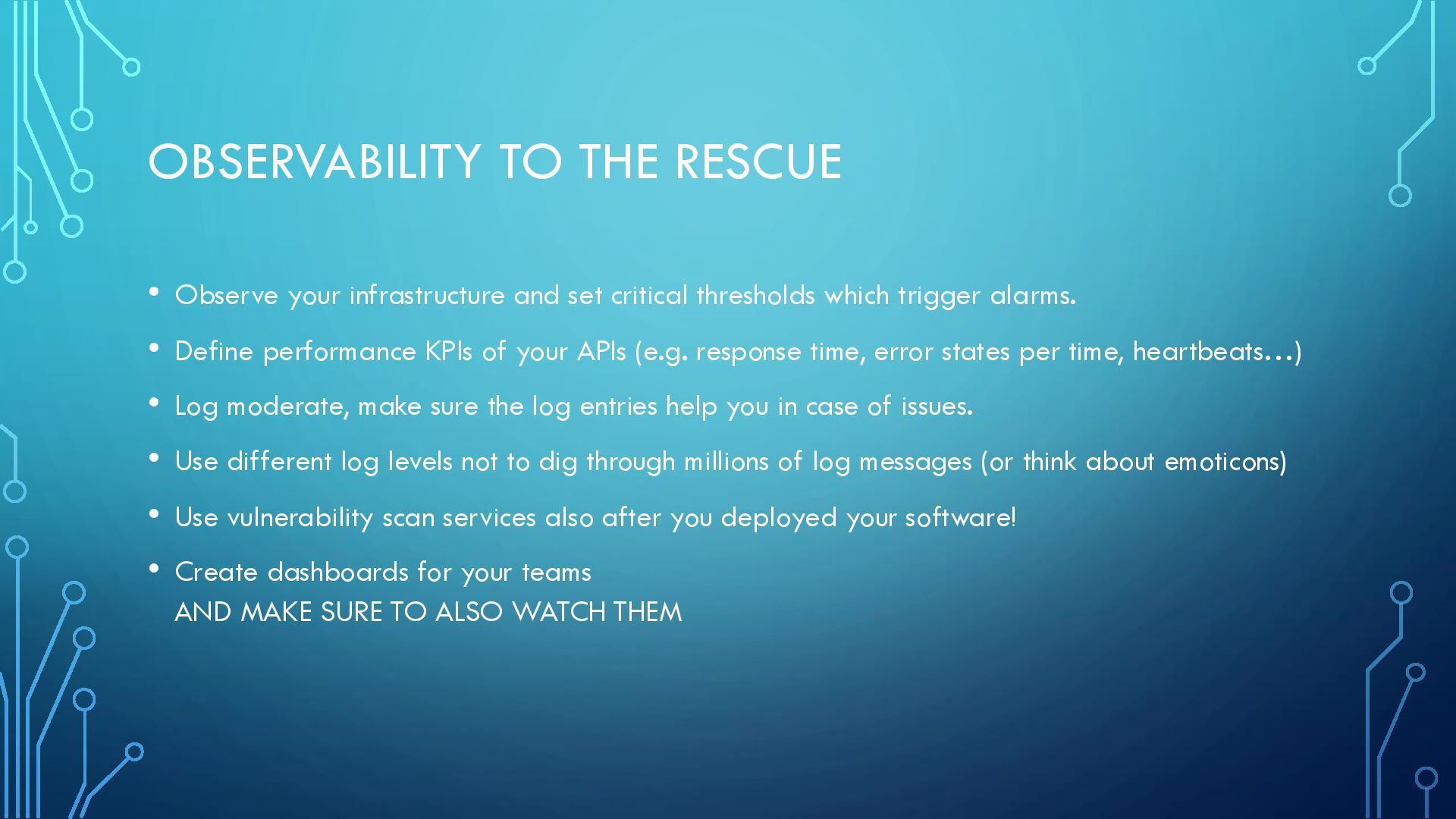 critical thresholds which trigger alarms. • Define performance KPIs of your APIs (e.g. response time, error states per time, heartbeats…) • Log moderate, make sure the log entries help you in case of issues. • Use different log levels not to dig through millions of log messages (or think about emoticons) • Use vulnerability scan services also after you deployed your software! • Create dashboards for your teams AND MAKE SURE TO ALSO WATCH THEM