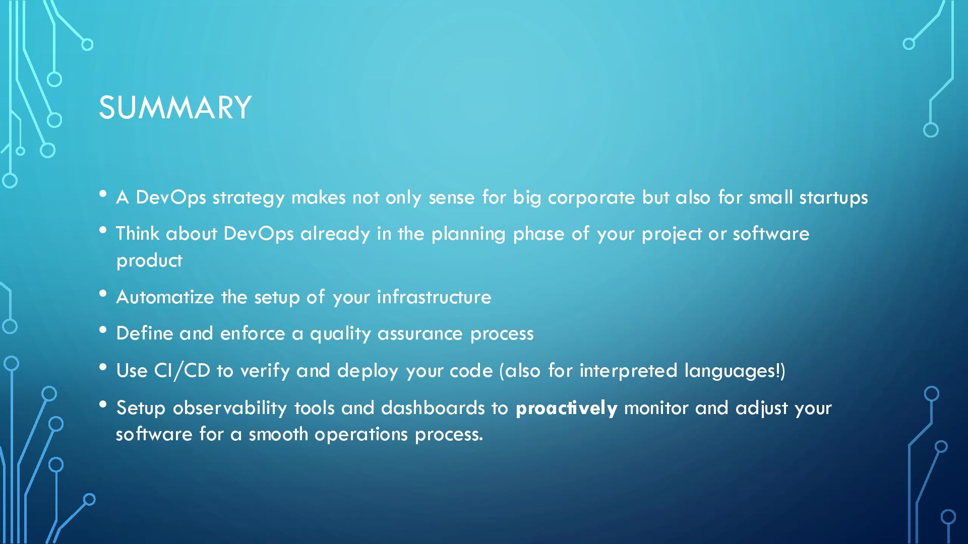 big corporate but also for small startups • Think about DevOps already in the planning phase of your project or software product • Automatize the setup of your infrastructure • Define and enforce a quality assurance process • Use CI/CD to verify and deploy your code (also for interpreted languages!) • Setup observability tools and dashboards to proactively monitor and adjust your software for a smooth operations process.