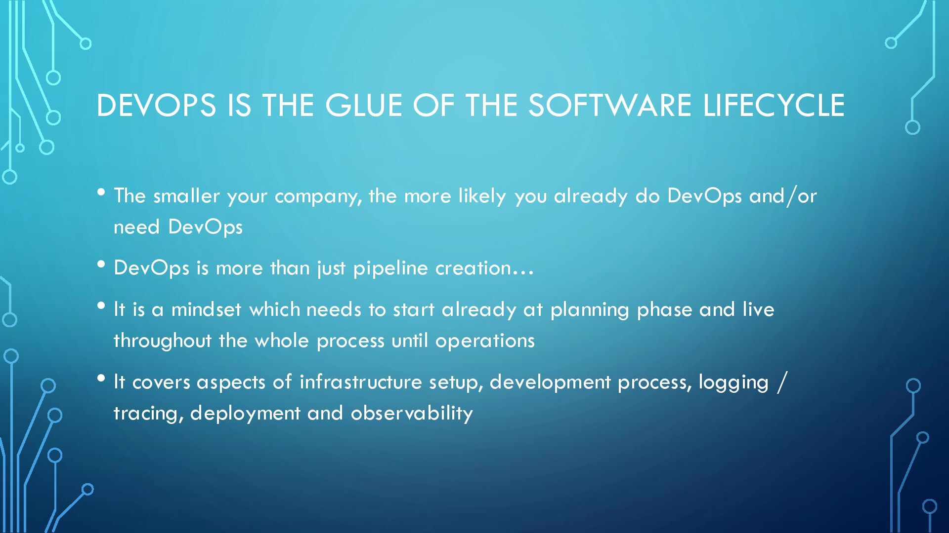 smaller your company, the more likely you already do DevOps and/or need DevOps • DevOps is more than just pipeline creation… • It is a mindset which needs to start already at planning phase and live throughout the whole process until operations • It covers aspects of infrastructure setup, development process, logging / tracing, deployment and observability