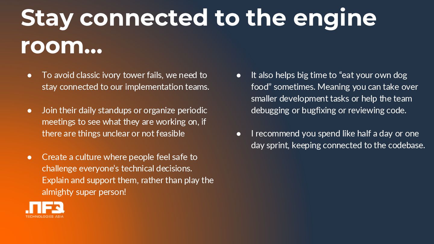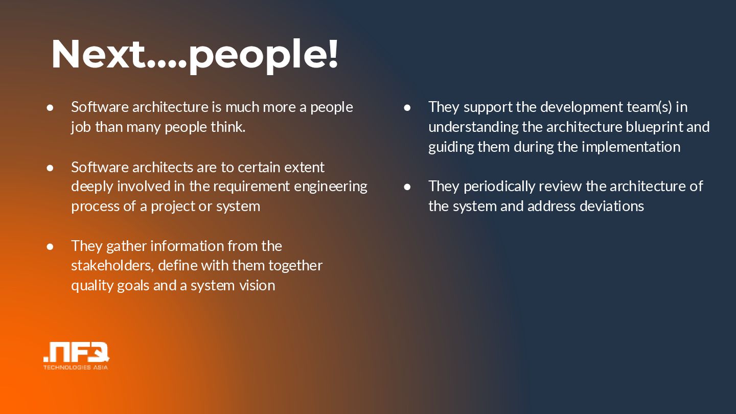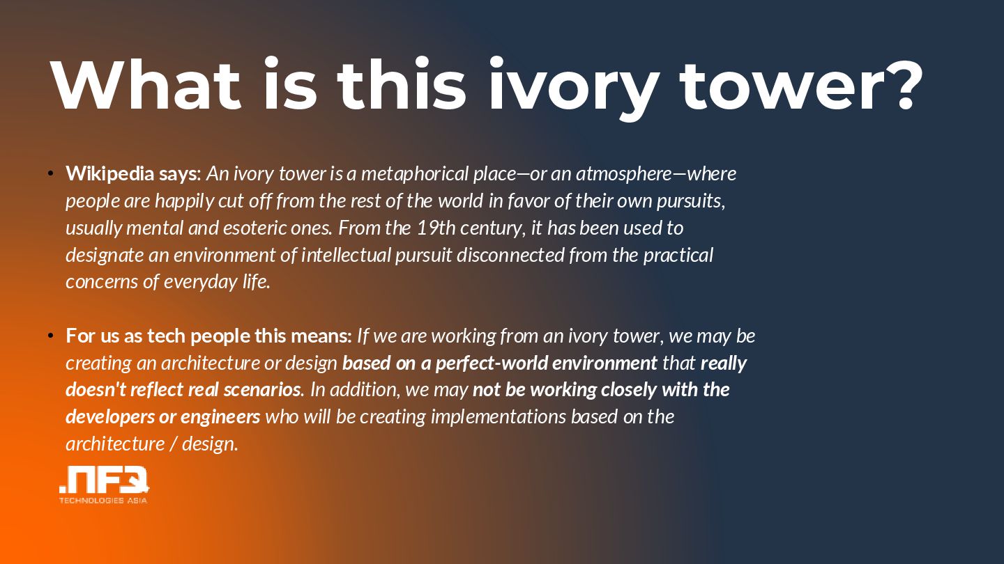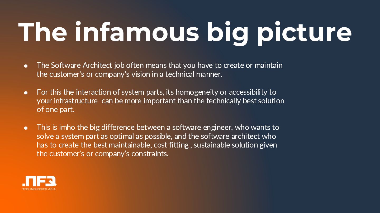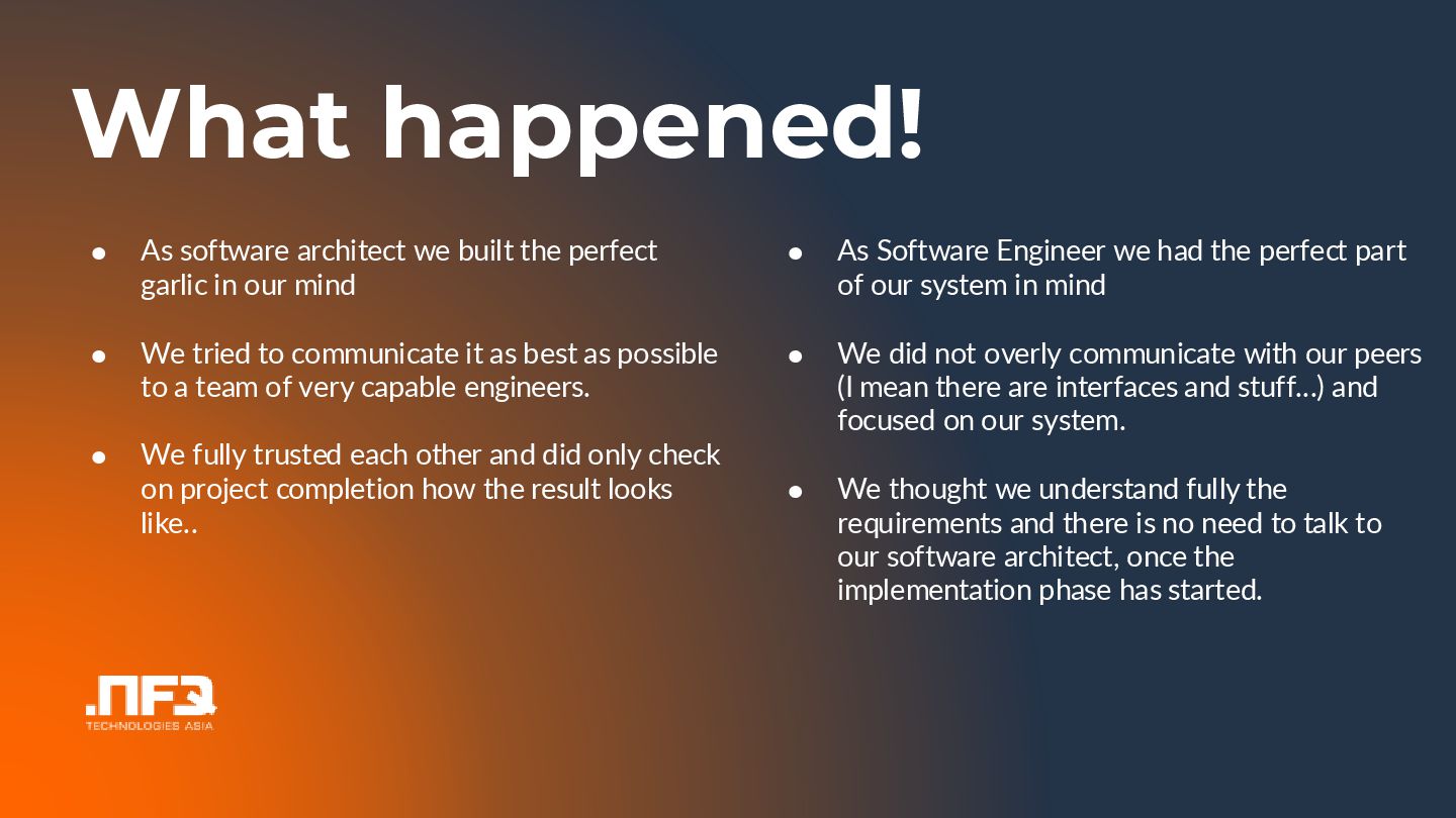 In this talk I will tell you a story about an architect and a dev team wanting to develop a perfect product...the outcome is...well see and hear for yourself :)... In the talk I will point out common problems in the communication betweeen developers and architects, and show potential mitigations.