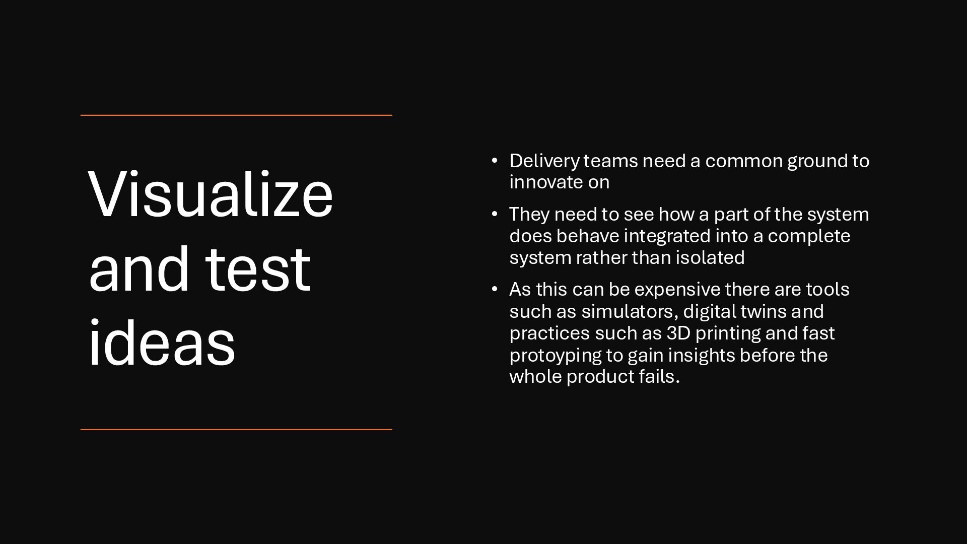 ground to innovate on • They need to see how a part of the system does behave integrated into a complete system rather than isolated • As this can be expensive there are tools such as simulators, digital twins and practices such as 3D printing and fast protoyping to gain insights before the whole product fails.