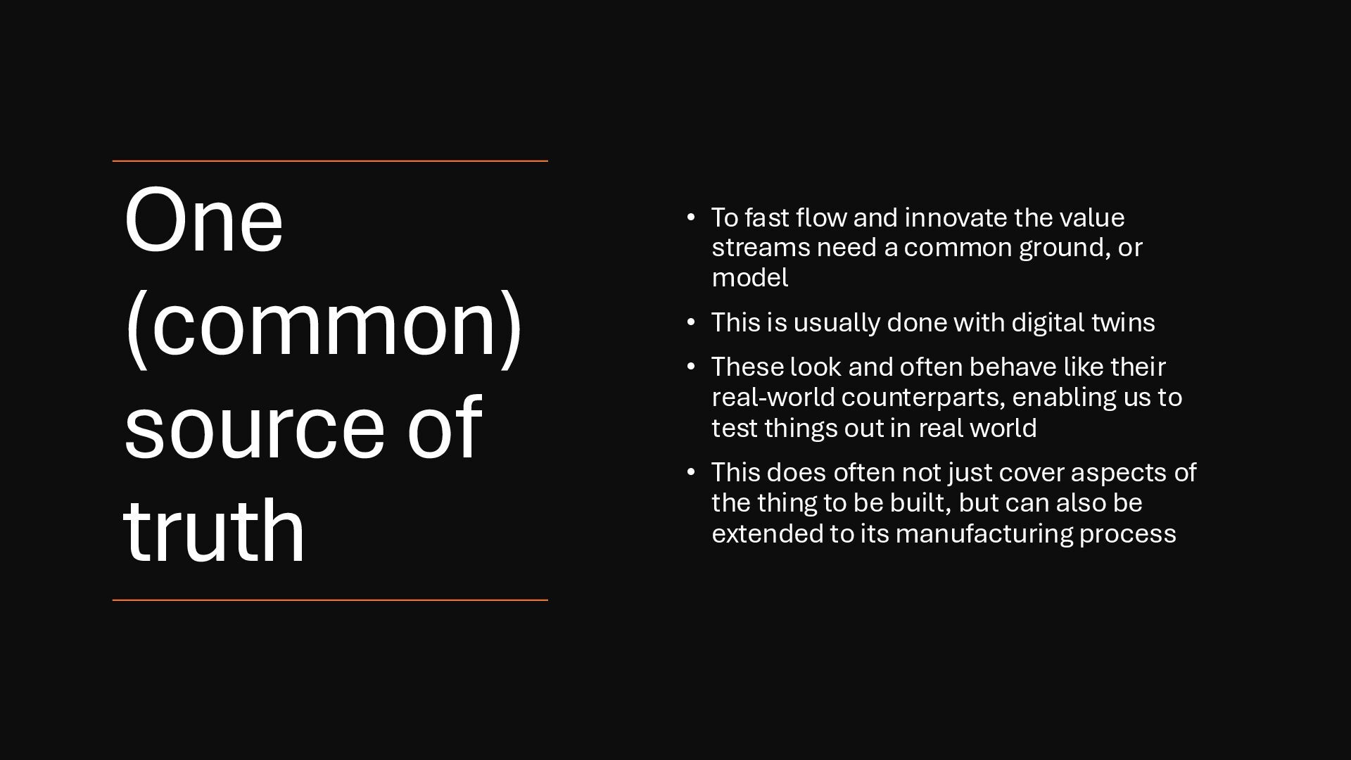 innovate the value streams need a common ground, or model • This is usually done with digital twins • These look and often behave like their real-world counterparts, enabling us to test things out in real world • This does often not just cover aspects of the thing to be built, but can also be extended to its manufacturing process
