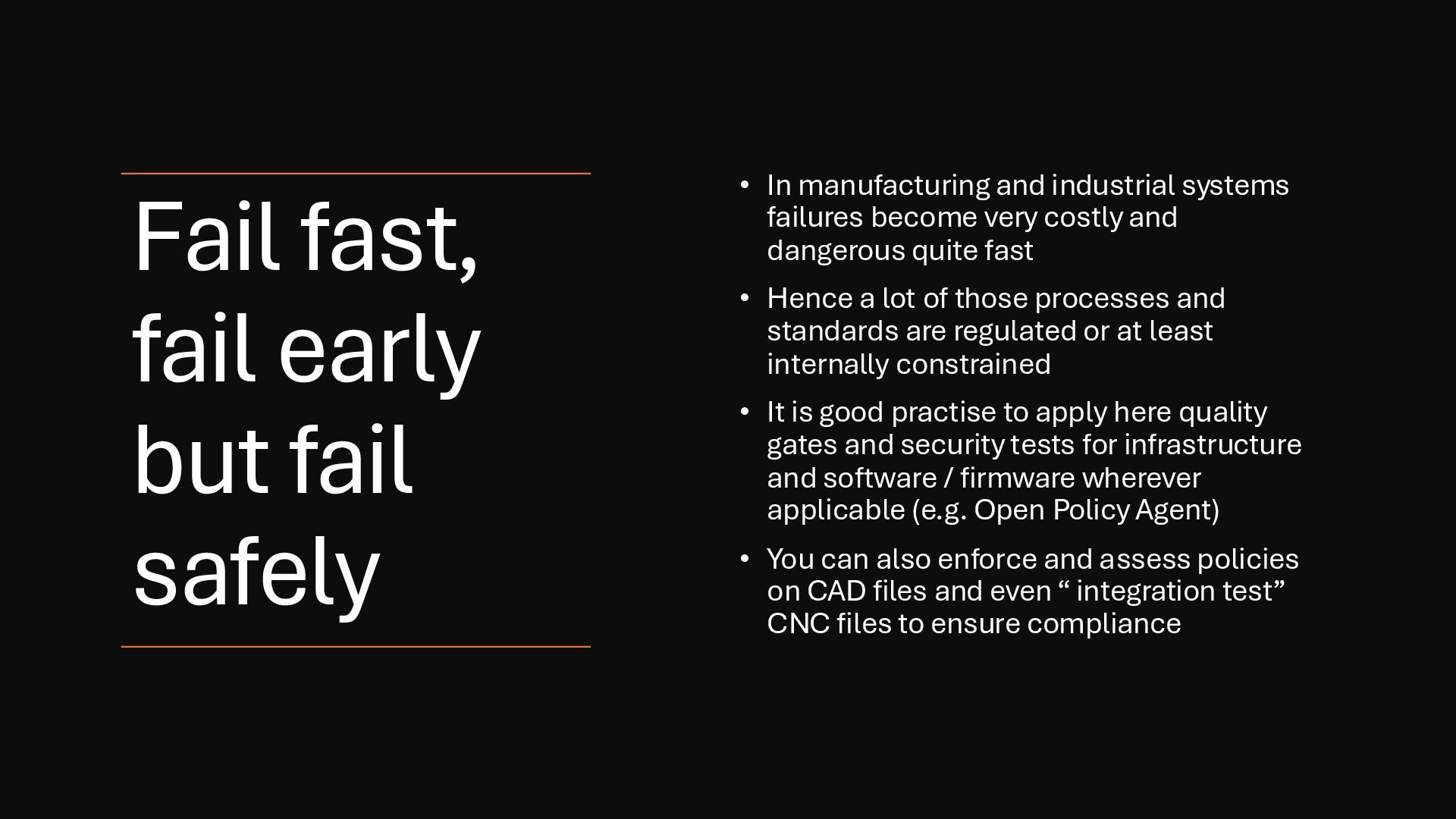 and industrial systems failures become very costly and dangerous quite fast • Hence a lot of those processes and standards are regulated or at least internally constrained • It is good practise to apply here quality gates and security tests for infrastructure and software / firmware wherever applicable (e.g. Open Policy Agent) • You can also enforce and assess policies on CAD files and even “ integration test” CNC files to ensure compliance