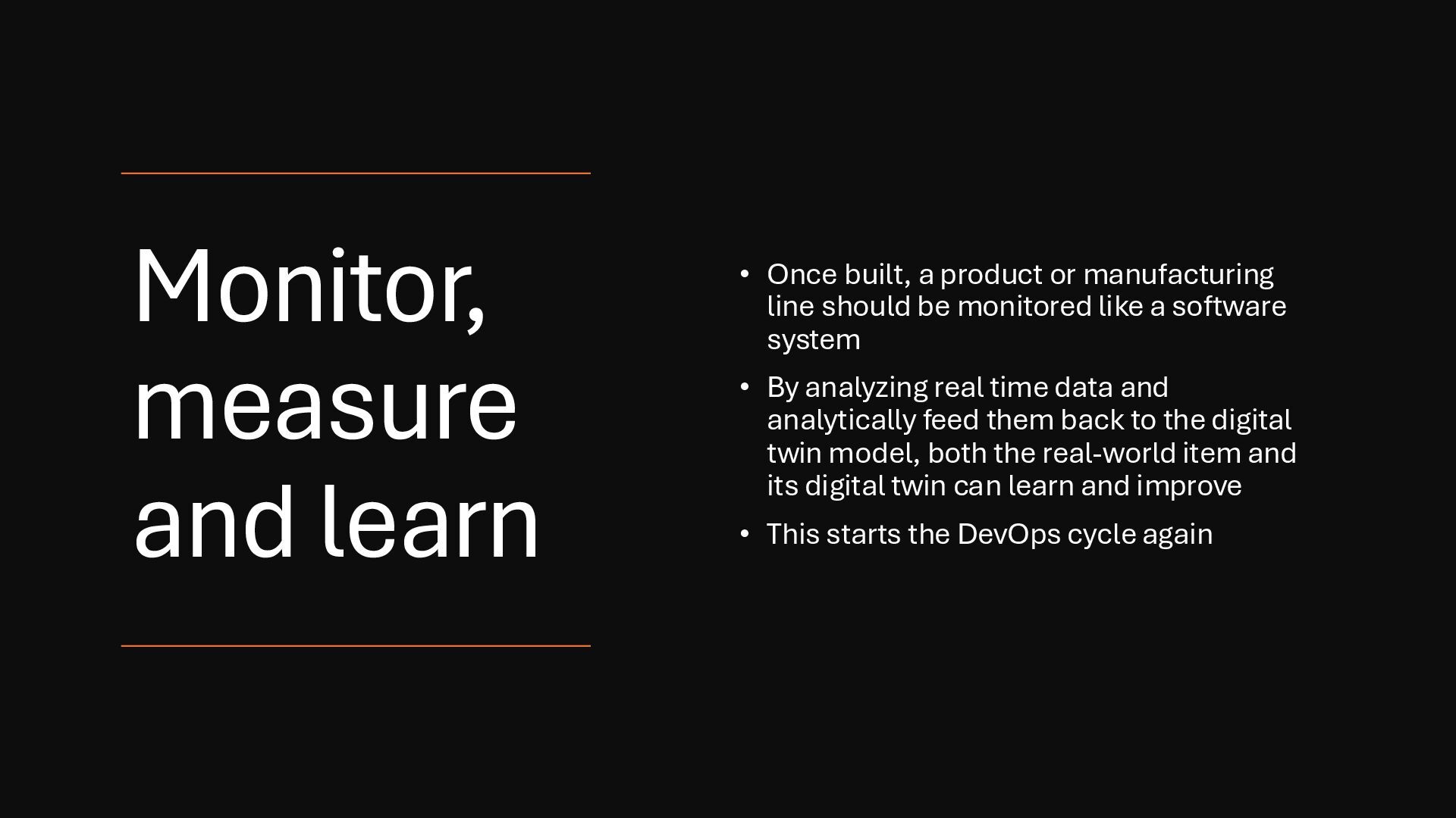 manufacturing line should be monitored like a software system • By analyzing real time data and analytically feed them back to the digital twin model, both the real-world item and its digital twin can learn and improve • This starts the DevOps cycle again