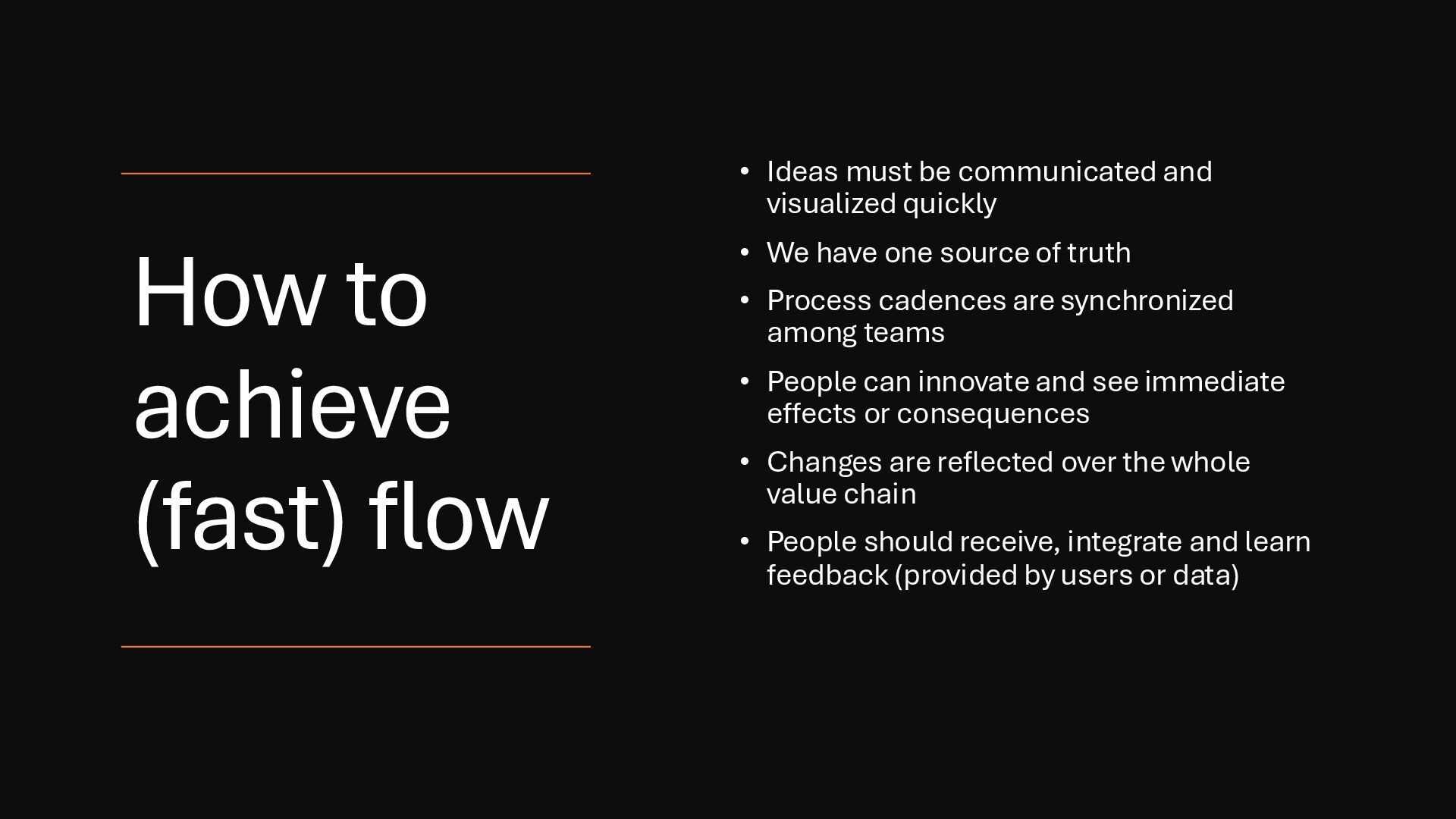 and visualized quickly • We have one source of truth • Process cadences are synchronized among teams • People can innovate and see immediate effects or consequences • Changes are reflected over the whole value chain • People should receive, integrate and learn feedback (provided by users or data)