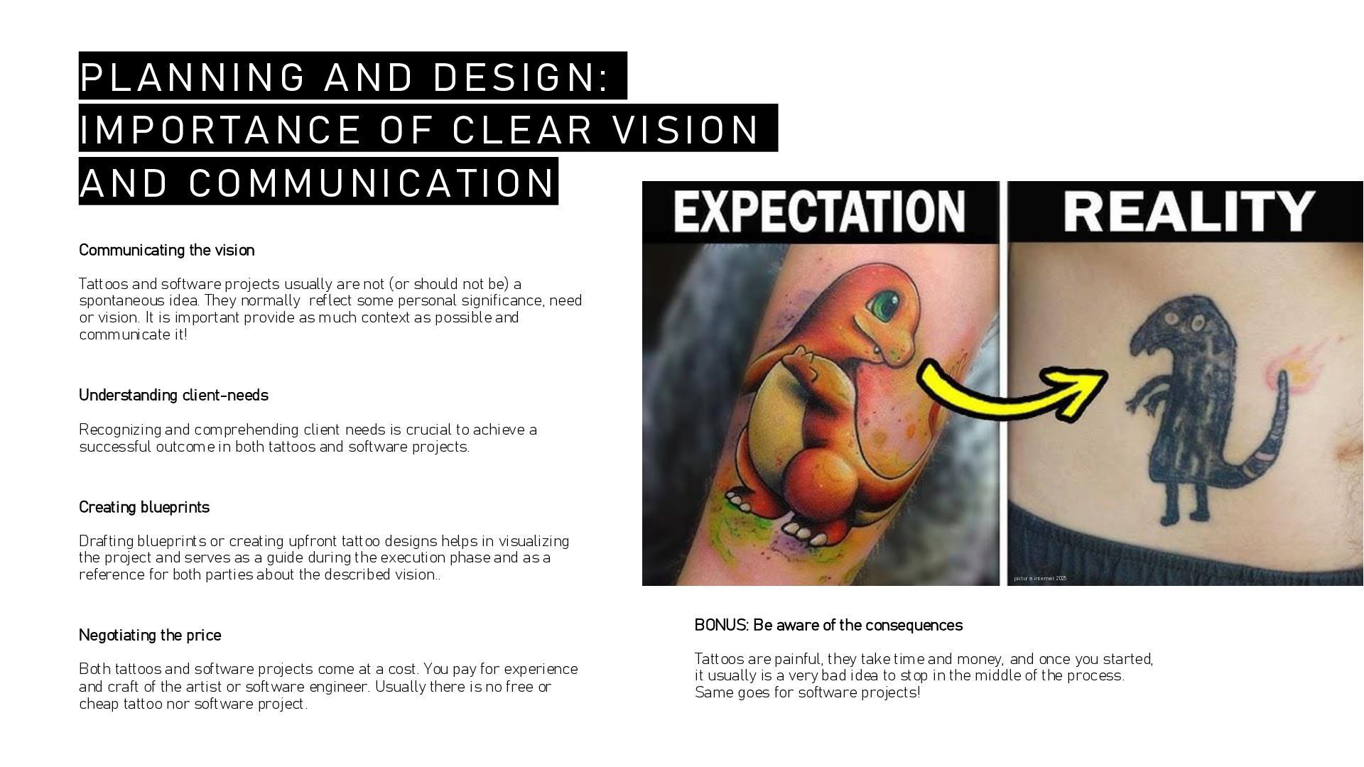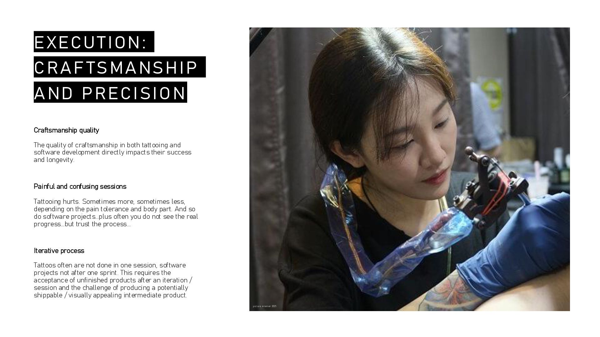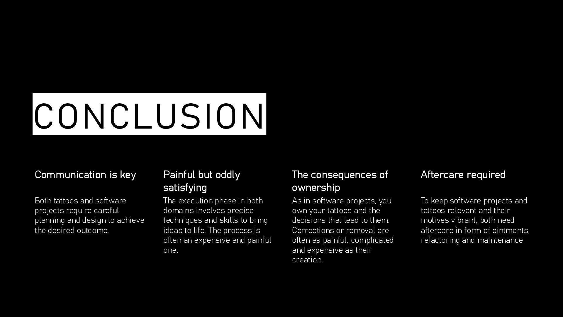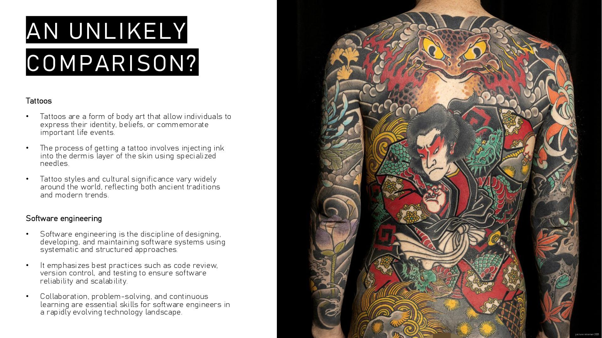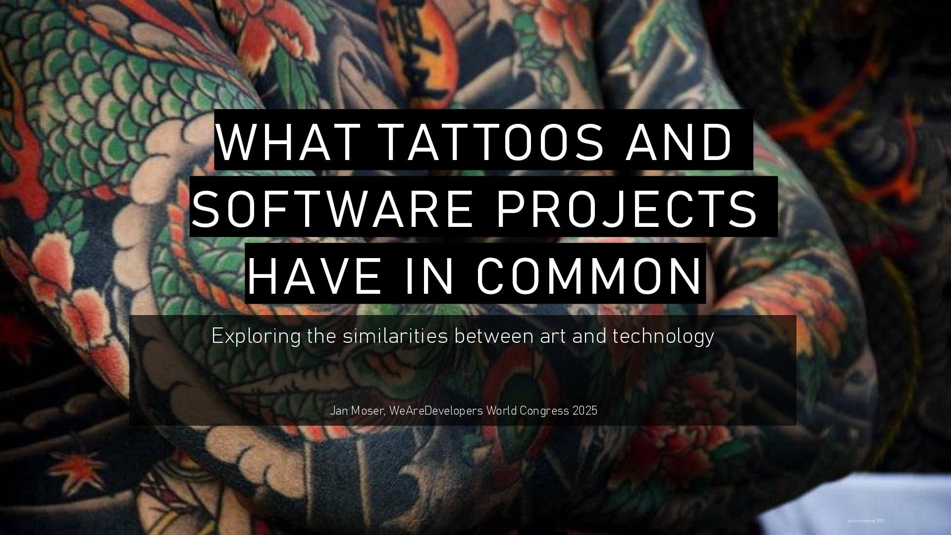 In this session, we’ll explore why getting a tattoo and building software aren’t as different as they might seem. Both require vision, trust, and a steady hand; whether it’s ink hitting skin or code hitting production. We’ll look at how great artists and great developers share a respect for careful planning, a willingness to iterate, and the courage to commit. By the end, you’ll see that whether you’re holding a tattoo gun or a keyboard, the path to something remarkable is forged through patience, care, and embracing the unexpected. As a tattooed software guy i know of what i am speaking :)