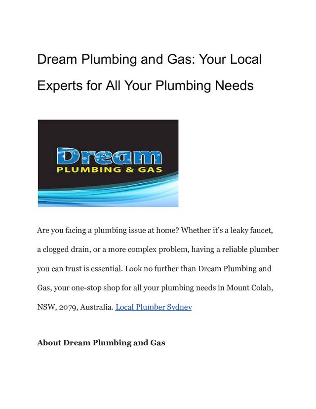 Are you facing a plumbing issue at home? Whether it’s a leaky faucet, a clogged drain, or a more complex problem, having a reliable plumber you can trust is essential. Look no further than Dream Plumbing and Gas, your one-stop shop for all your plumbing needs in Mount Colah, NSW, 2079, Australia. Local Plumber Sydney https://dreamplumbing.com.au/