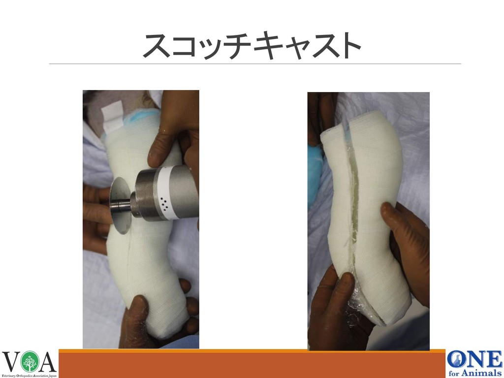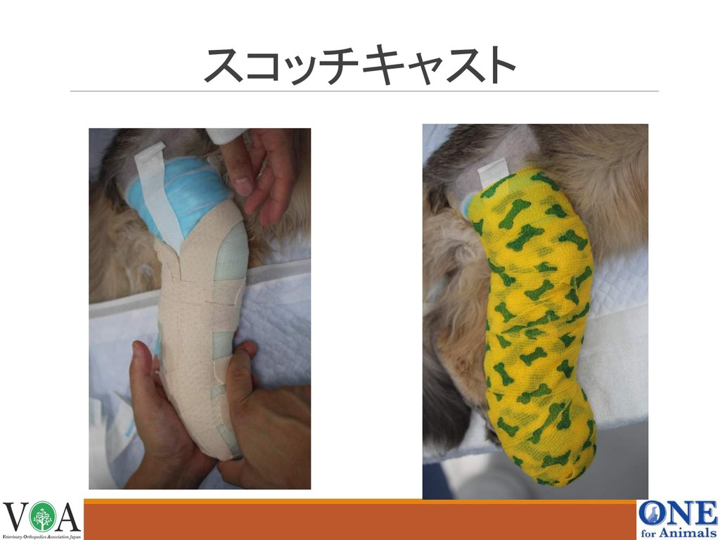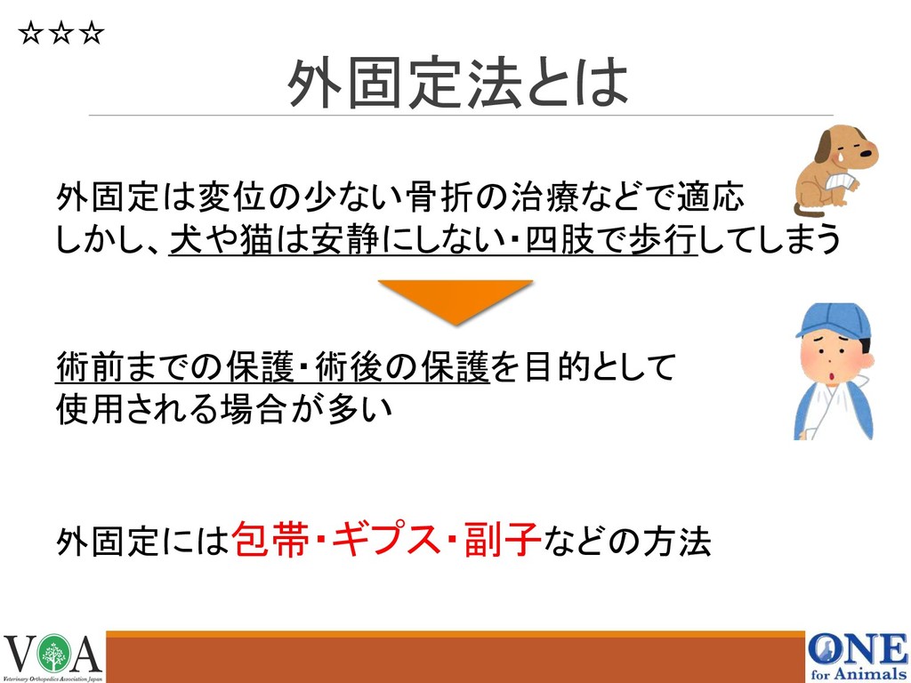 外固定法とは 外固定は変位の少ない骨折の治療などで適応 しかし、犬や猫は安静にしない・四肢で歩行してしまう 術前までの保護・術後の保護を目的として 使用される場合が多い 外固定には包帯・ギプス・副子などの方法 ☆☆☆