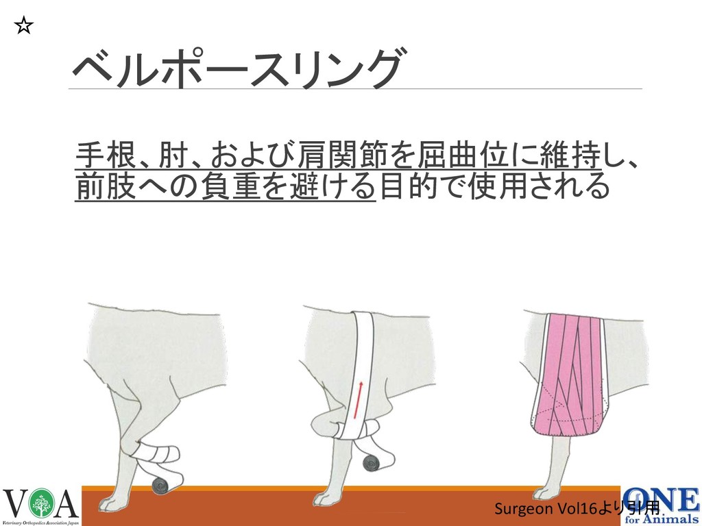 ベルポースリング 手根、肘、および肩関節を屈曲位に維持し、 前肢への負重を避ける目的で使用される Surgeon Vol16より引用 ☆