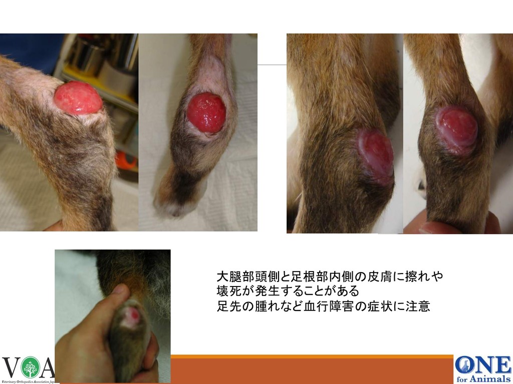 大腿部頭側と足根部内側の皮膚に擦れや 壊死が発生することがある 足先の腫れなど血行障害の症状に注意