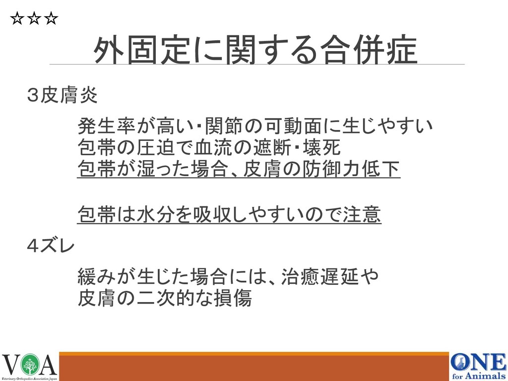 外固定に関する合併症 1関節硬直 関節の線維化によって、関節包、筋肉、靭帯など の 癒着,回復が困難 2患肢の腫脹 過度な圧迫では、足先の血流が低下する 重度では、組織の虚血が生じる 臭い・足先を触られるのを嫌がるなど ☆☆☆