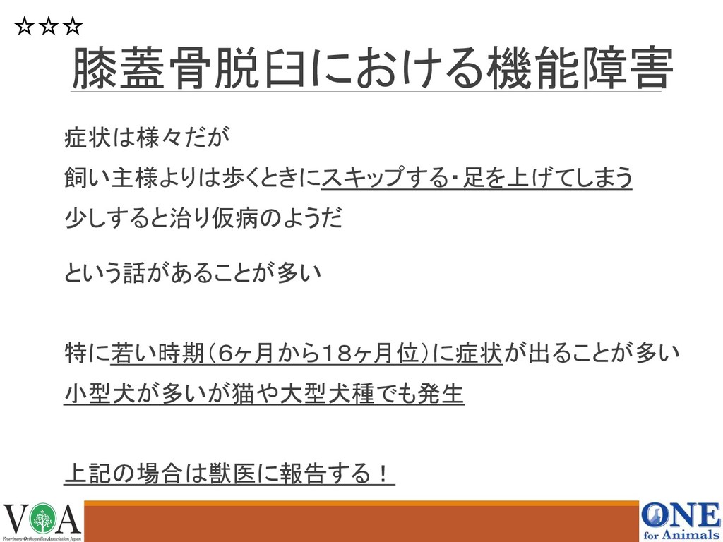 膝蓋骨脱臼における機能障害 症状は様々だが 飼い主様よりは歩くときにスキップする・足を上げてしまう 少しすると治り仮病のようだ という話があることが多い 特に若い時期(6ヶ月から18ヶ月位)に症状が出ることが多い 小型犬が多いが猫や大型犬種でも発生 上記の場合は獣医に報告する! ☆☆☆
