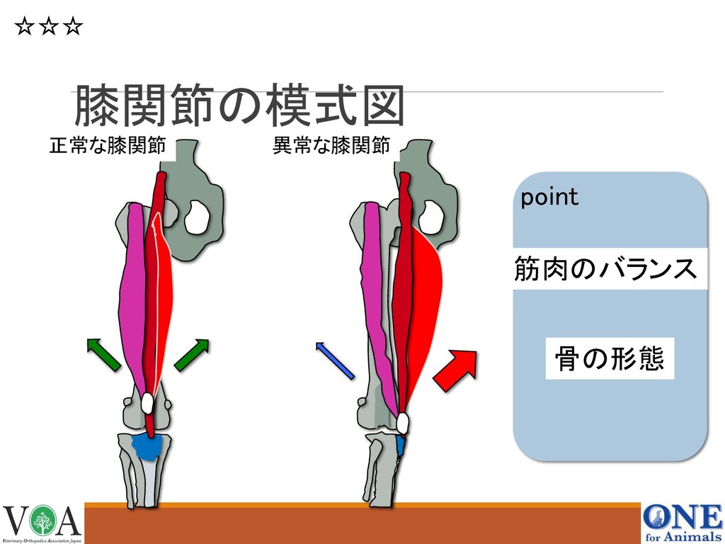 膝関節の模式図 正常な膝関節 異常な膝関節 筋肉のバランス point 骨の形態 ☆☆☆
