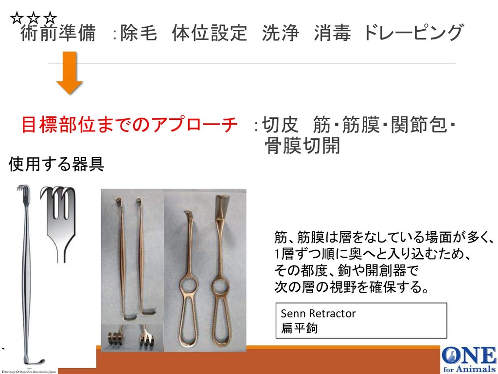 使用する器具 筋、筋膜は層をなしている場面が多く、 1層ずつ順に奥へと入り込むため、 その都度、鉤や開創器で 次の層の視野を確保する。 Senn Retractor 扁平鉤 ☆☆☆