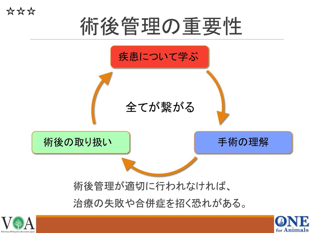 疾患について学ぶ 手術の理解 術後の取り扱い 術後管理の重要性 全てが繋がる 術後管理が適切に行われなければ、 治療の失敗や合併症を招く恐れがある。 ☆☆☆