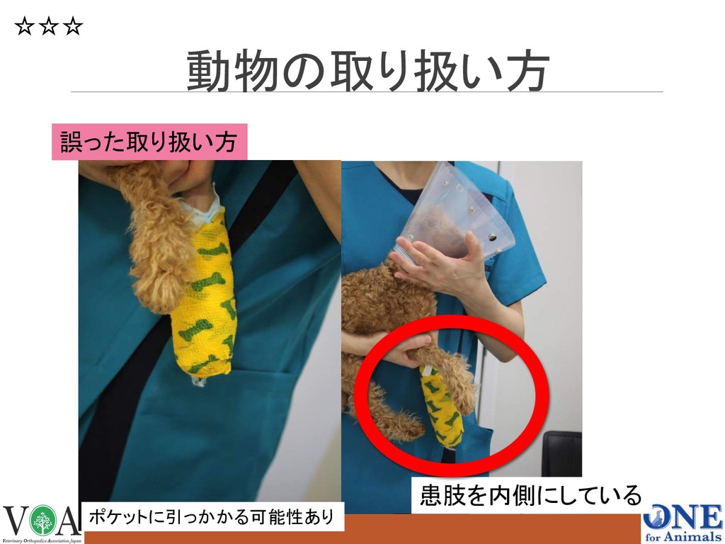 動物の取り扱い方 誤った取り扱い方 患肢を内側にしている ポケットに引っかかる可能性あり ☆☆☆