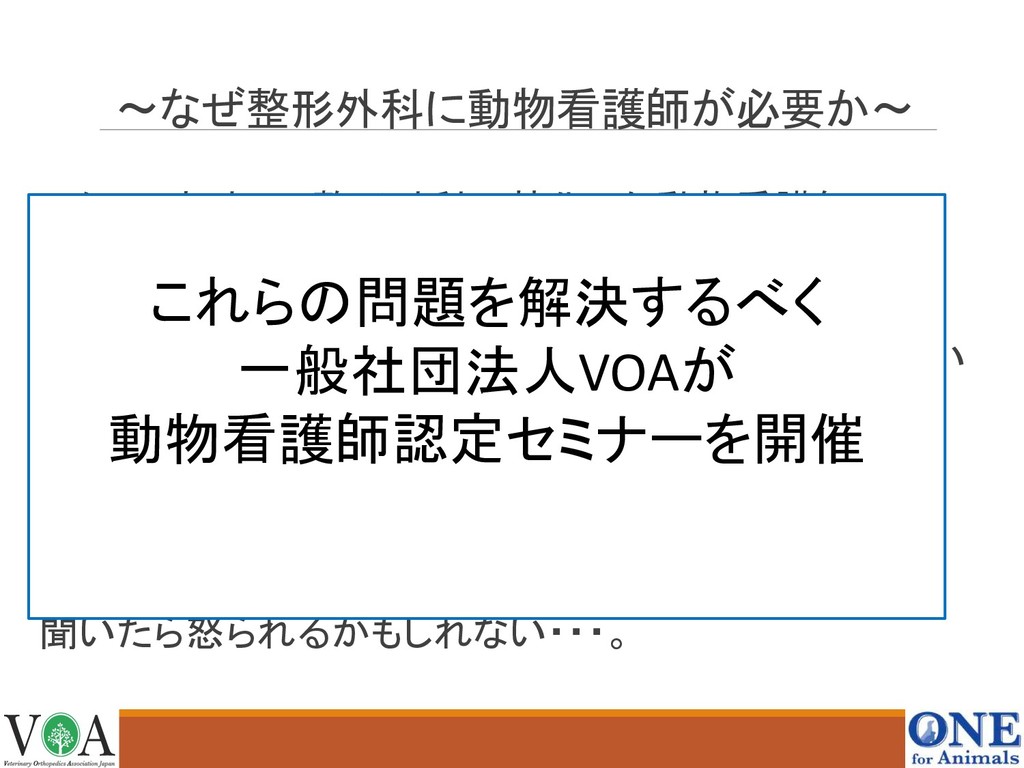 〜なぜ整形外科に動物看護師が必要か〜 しかしこれまで、整形外科に特化した動物看護師 という概念がない 教科書はなく、その病院の独自のやり方しかわからない 器具の洗浄・滅菌方法などもわからない 疑問に思っても院長や獣医に聞くことができない 聞いたら怒られるかもしれない・・・。 これらの問題を解決するべく 一般社団法人VOAが 動物看護師認定セミナーを開催