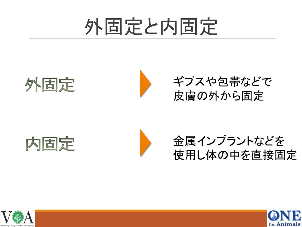 外固定と内固定 金属インプラントなどを 使用し体の中を直接固定 ギプスや包帯などで 皮膚の外から固定