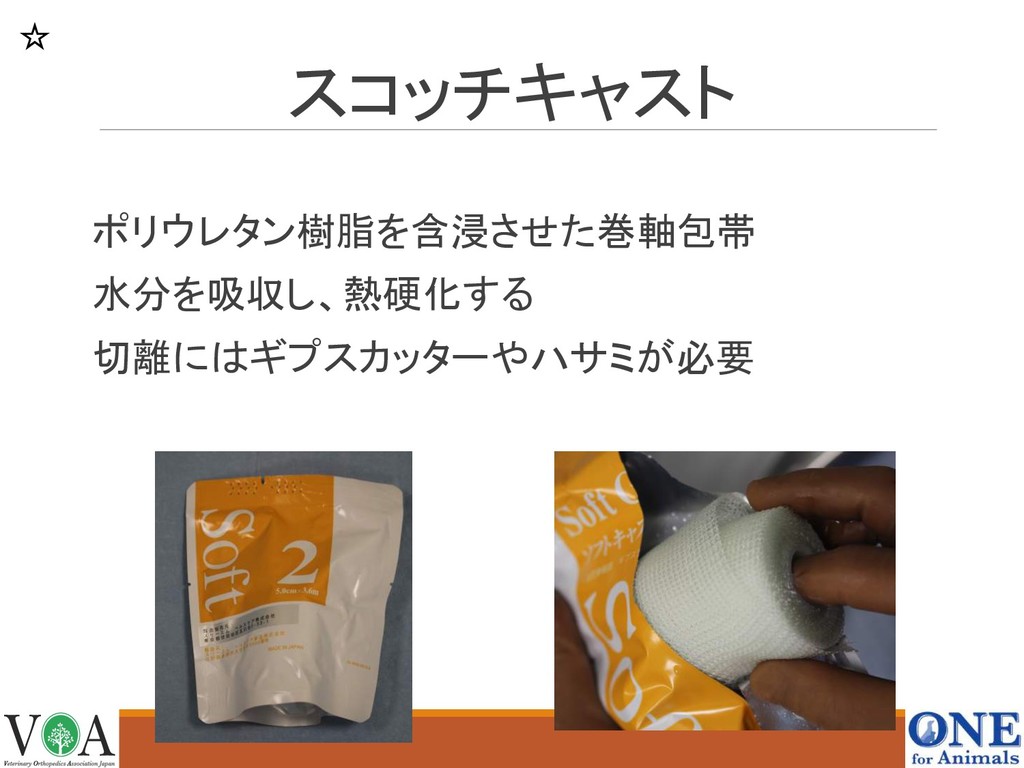 スコッチキャスト ポリウレタン樹脂を含浸させた巻軸包帯 水分を吸収し、熱硬化する 切離にはギプスカッターやハサミが必要 ☆