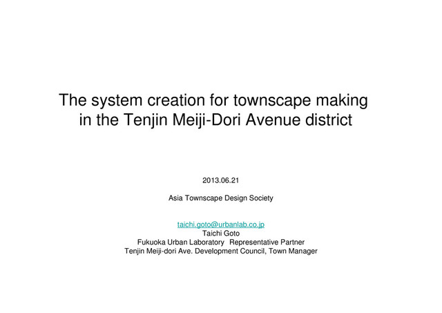 the buildings are over 40 years old and within the next 20 years they are expected to reach the point of having to be reconstructed. Therefore, the Tenjin Meiji-dori Ave. Development Council, called MDC, aiming to create a business district that will be globally admired, worked out a vision called “Grand Design” in May 2009 to portray the future image of the district. And now, we have put together a manual and a district plan to realize the future image. Please use these guidelines from now on, as reference when planning for district improvement or individual projects. In this council we would like to continue promoting city planning in cooperation with property owners, so to enhance the value of the whole district.